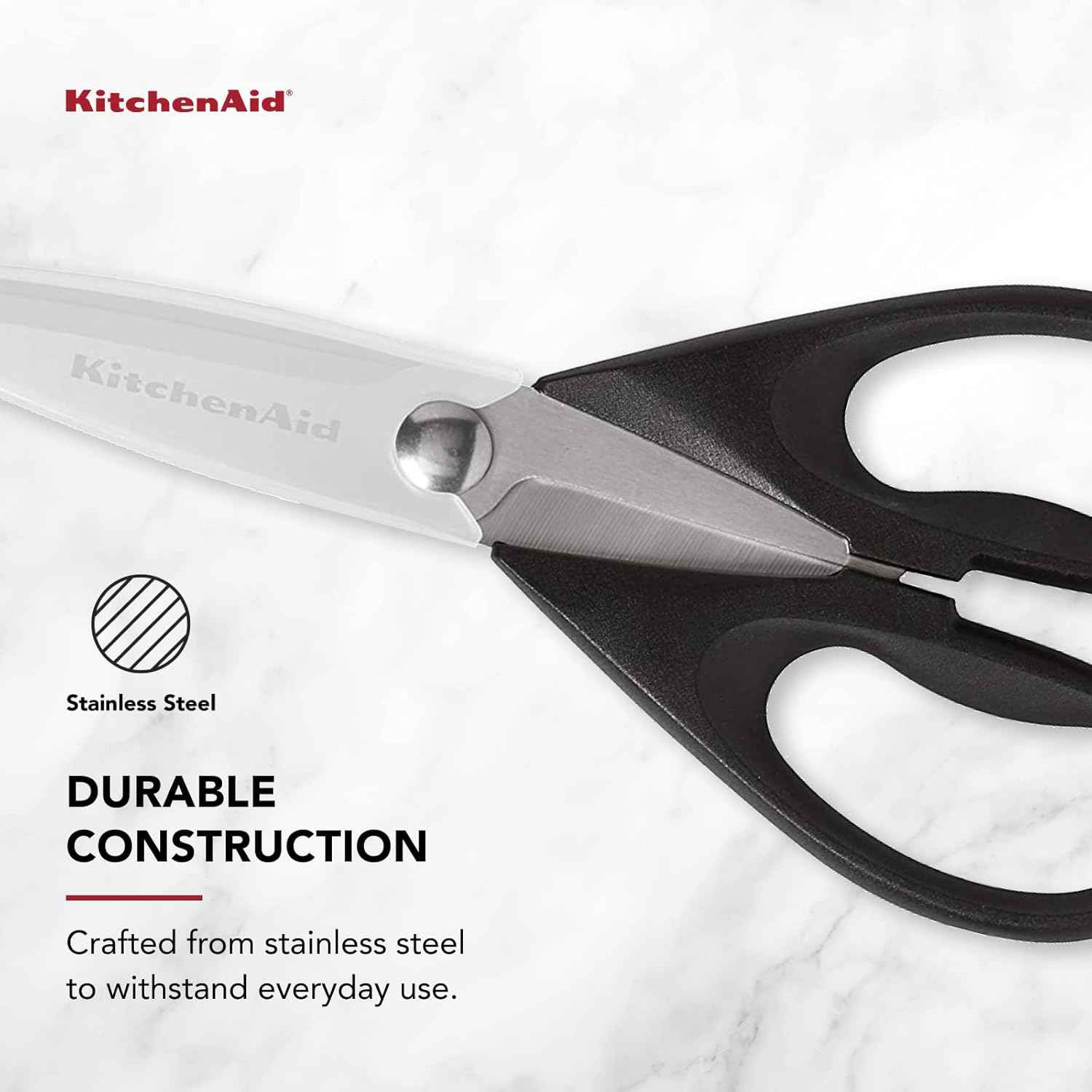 These all-purpose shears from KitchenAid are a valuable addition to your kitchen utensils set and ideal for a variety of tasks throughout the home, from slicing poultry and pizza to clipping coupons. The blade edges feature micro-serrations to provide a superior cutting experience. Durable and strong, these kitchen scissors are made from heavy-duty stainless steel that withstands daily use, with soft-grip handles that provide comfort and control while using. The shears come with a blade guard to protect blades when stored. Dishwasher safe; hand washing is recommended.