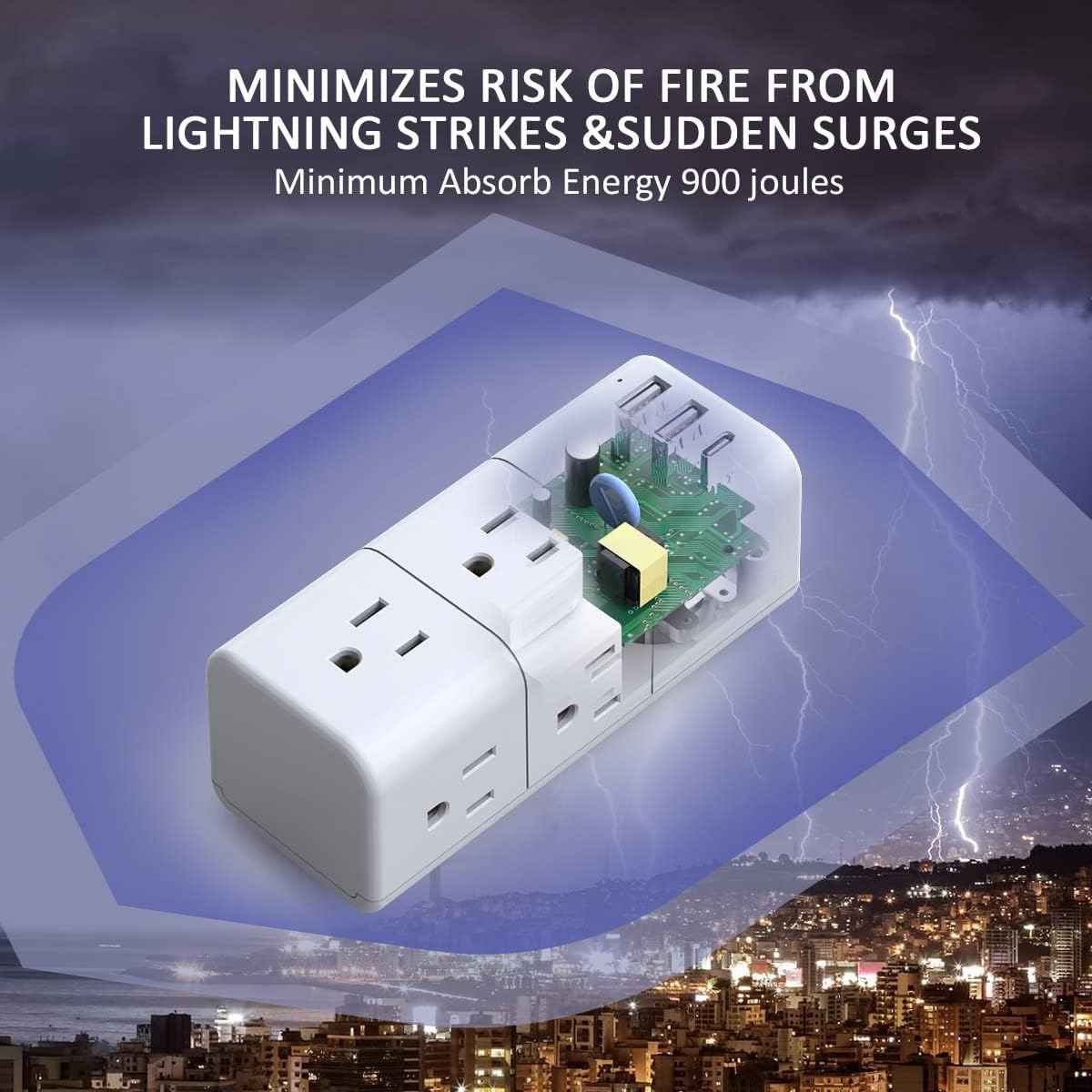 This USB Multi Plug Outlet Extender comes with a surge protector, minimum energy-absorbing capacity of 900 Joules, Can provide some protection for your equipment from voltage fluctuations, surges, and spikes.