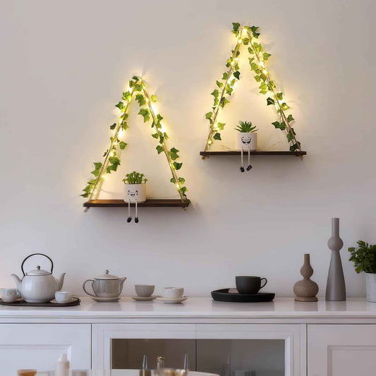 Floating Shelves for Wall, Hanging Shelves with Artificial Ivy LED String Light, No Drilling Hanging Shelf, Wood Hanging Plant Shelves for Wall DΓ©cor, Boho Decor, Art Bedroom, Set of 2