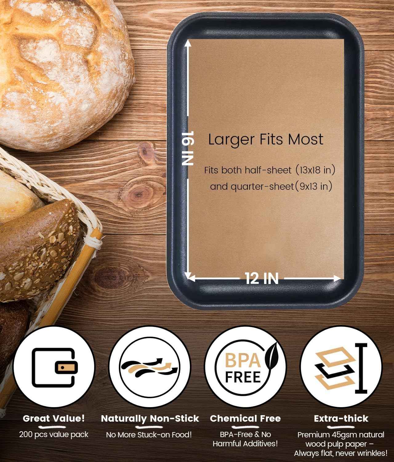 - 200 PCS Unbleached Parchment Paper Sheets for Baking 12x16 Inches, Non-Stick and Non-Toxic Pre-cut Parchment Sheets for Oven, Cooking, Grilling, Air Fryer and Steaming - Fit for Half Sheet Pans