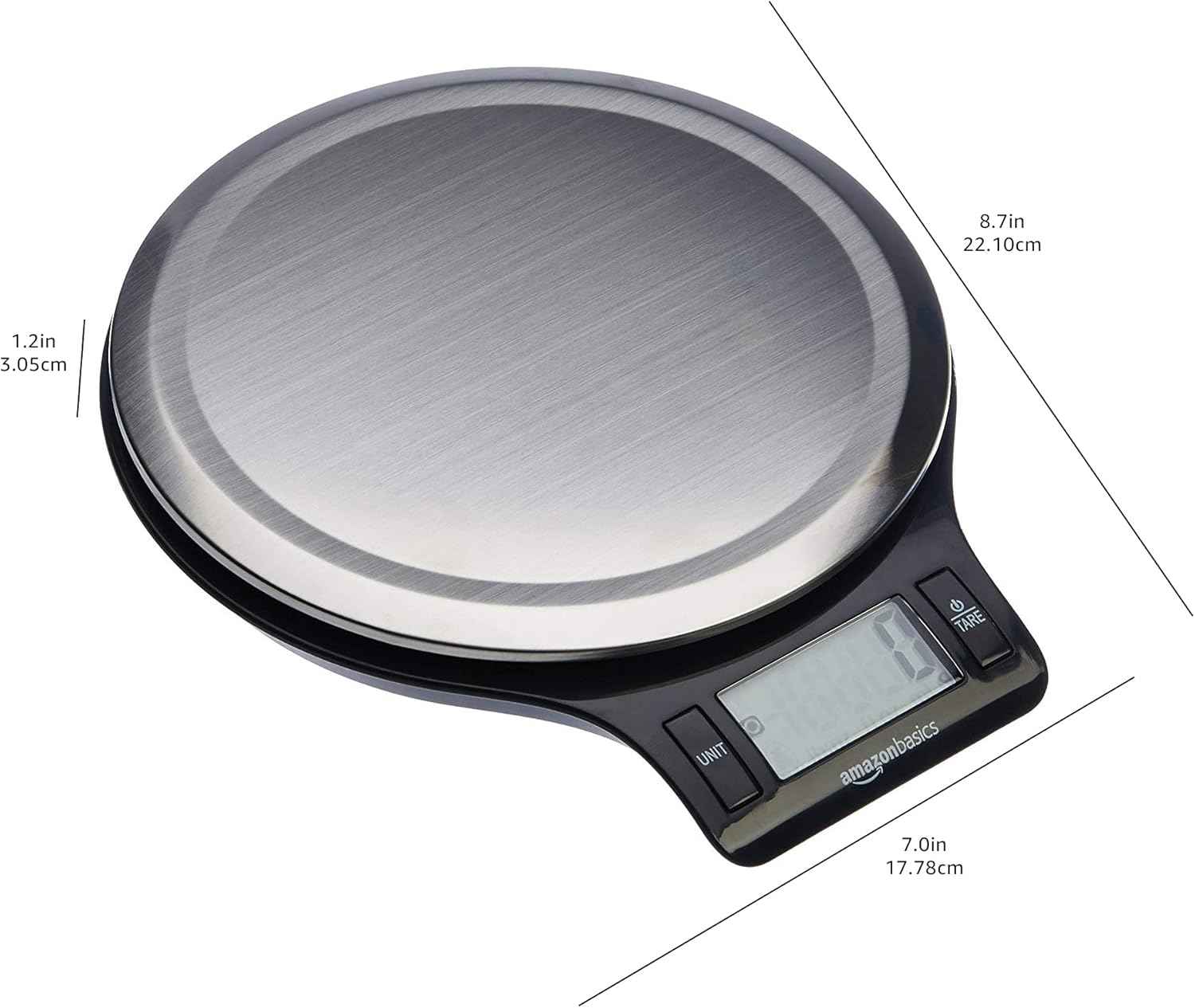- Amazon Basics Digital Kitchen Scale with LCD Display, Batteries Included, Weighs up to 11 pounds, Black and Stainless Steel