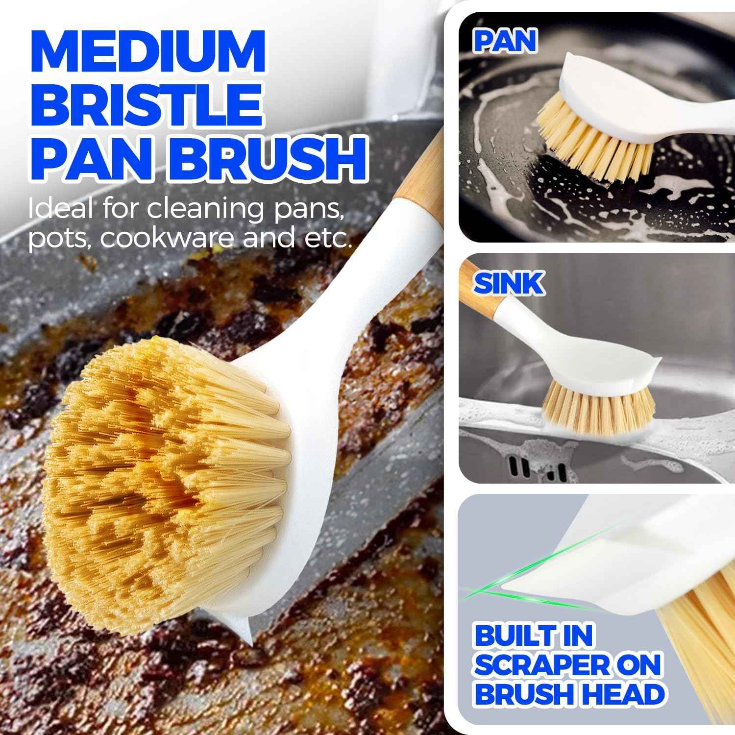 - Holikme 3 Pack Dish Brush Set with Bamboo Handle, Kitchen Brushes for Cleaning Pot, Sink and Stove, Skillet Scrubber with Tough Bristles for Cast Iron Grill Pan, Yellow White Black