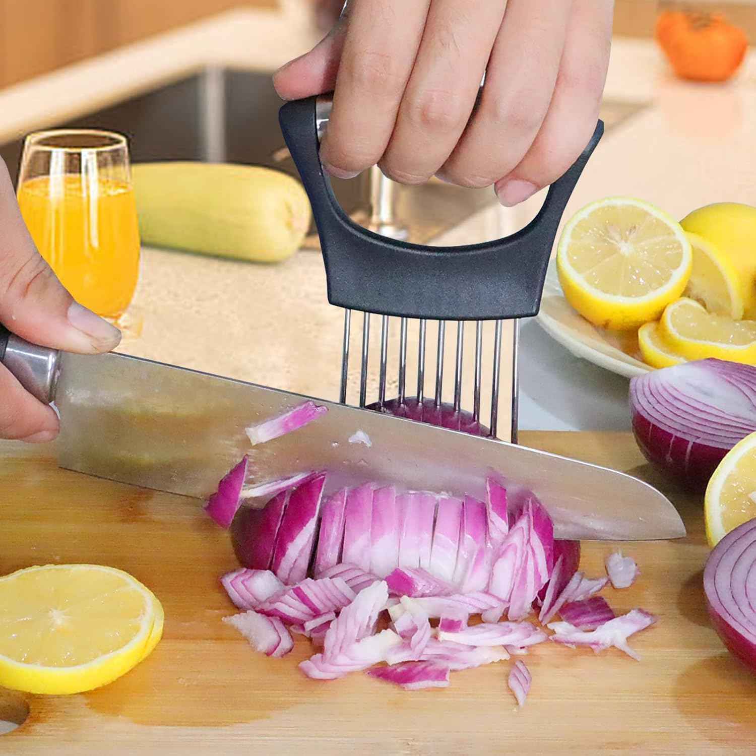 - JAYVAR Onion Holder for Slicing, Onion Cutter Vegetable Chopper, Stainless Steel Tomato Slicer Vegetable Cutter for Potato, Avocados, Eggs, Food Slicer Assistant Tool for Fruit Lemon and Meat