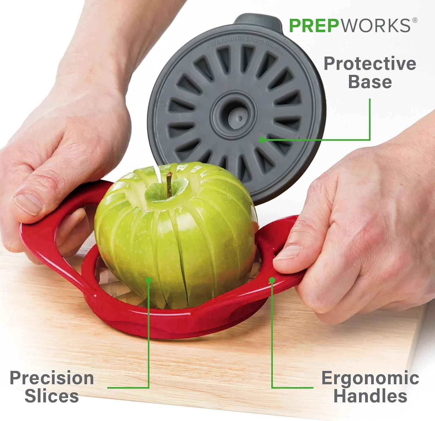 Make apple slicing quick and easy with the PrepWorks 16-Slice Thin Apple Slicer and Corer. This innovative tool slices and cores apples into 16 even pieces with a simple push, streamlining your food prep. Its attached safety cover not only protects your fingers during use but also safely covers the blades for storage. Combining style and functionality, this dishwasher-safe slicer is perfect for apples and other fruits. With over 40 years of kitchen innovation, PrepWorks delivers quality tools designed to simplify your meal prep experience.
