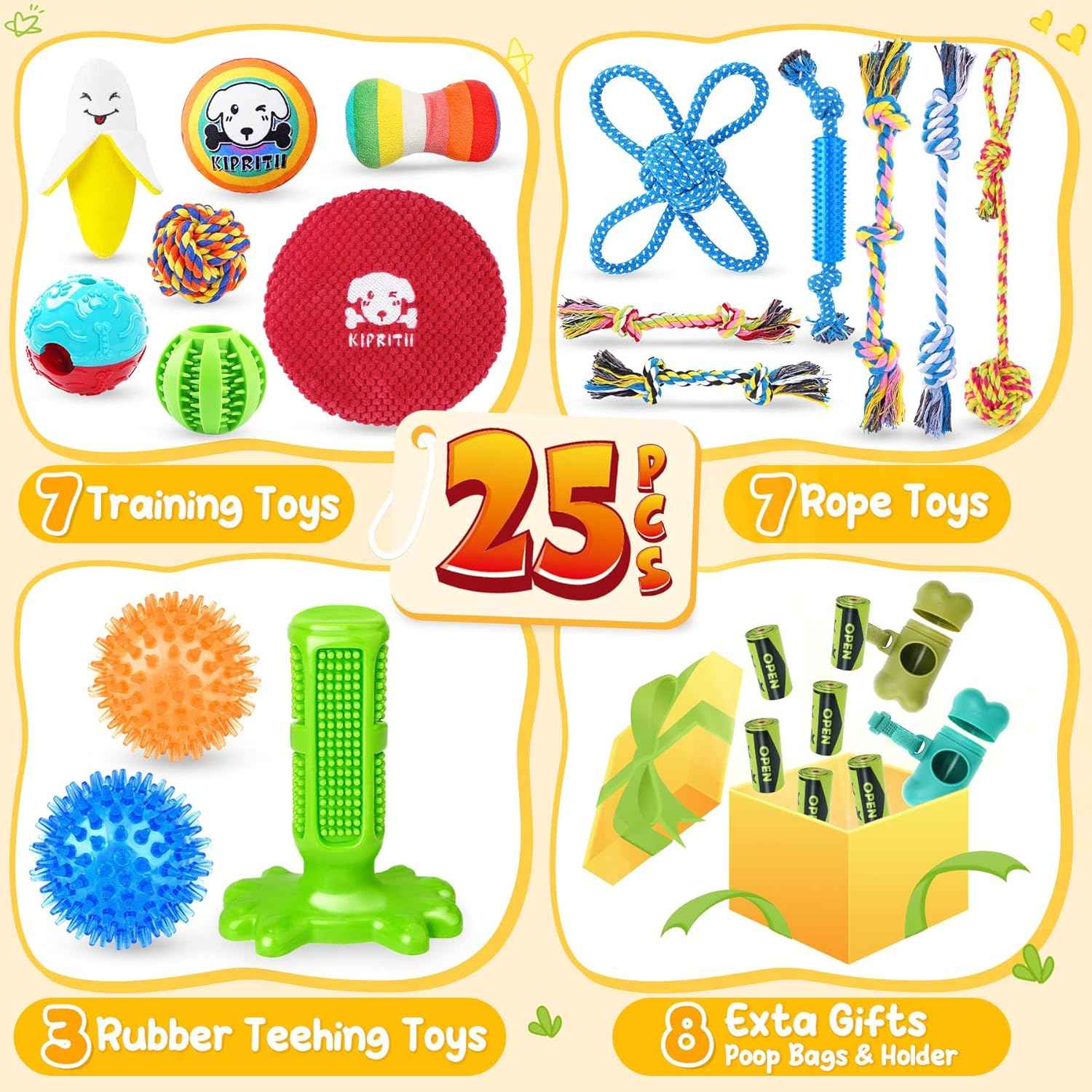 - KIPRITII 25 Pack Various Puppy Dog Toys for Teething, Entertainment & Interaction, Puppy Chew Toys Pack with Rope Toy, Treat Balls and Dog Squeaky Toys for Puppies & Small Dogs