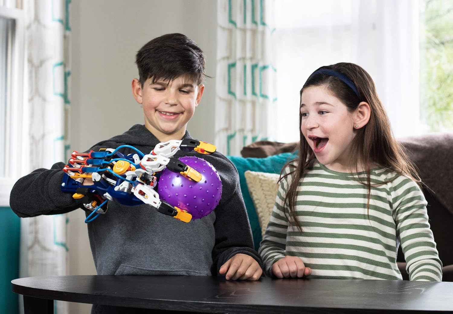 Explore hydraulics, pneumatics, and robotics with your very own GIANT hydraulic hand! Using over 200 plastic pieces and piston tubes that you fill with water, build an awesome mechanical hand that uses hydraulic power to simulate the movements of the human hand no motors or electricity required! Once assembled, your cyborg hand slips onto your own hand like a glove, with mechanical fingers that you operate with your own fingers and that can grip objects with enough force to lift them. Challenge yourself to pick up and hold a variety of items like bottles, pencils, small items anything with reach! The hand can be configured in three ways left hand, right hand, and claw-like, with the thumb in the center and can be adjusted to fit virtually all hand sizes. A 40-page, full-color manual guides model building and experimentation and provides engaging scientific information about how pneumatic and hydraulic systems are used in industrial robots to assist with a variety of tasks in our modern world.
