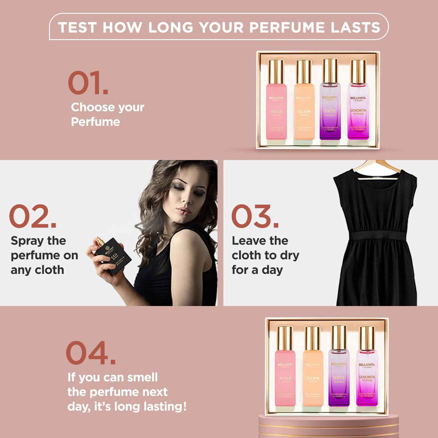 - BellaVita Luxury Women's Perfume Gift Set | 4x20ml | Notes of Floral, Sweet, Spicey Red Fruit, Vanilla & Musk | DATE, SENORITA, GLAM & ROSE | French Parfum Collection Gift Set