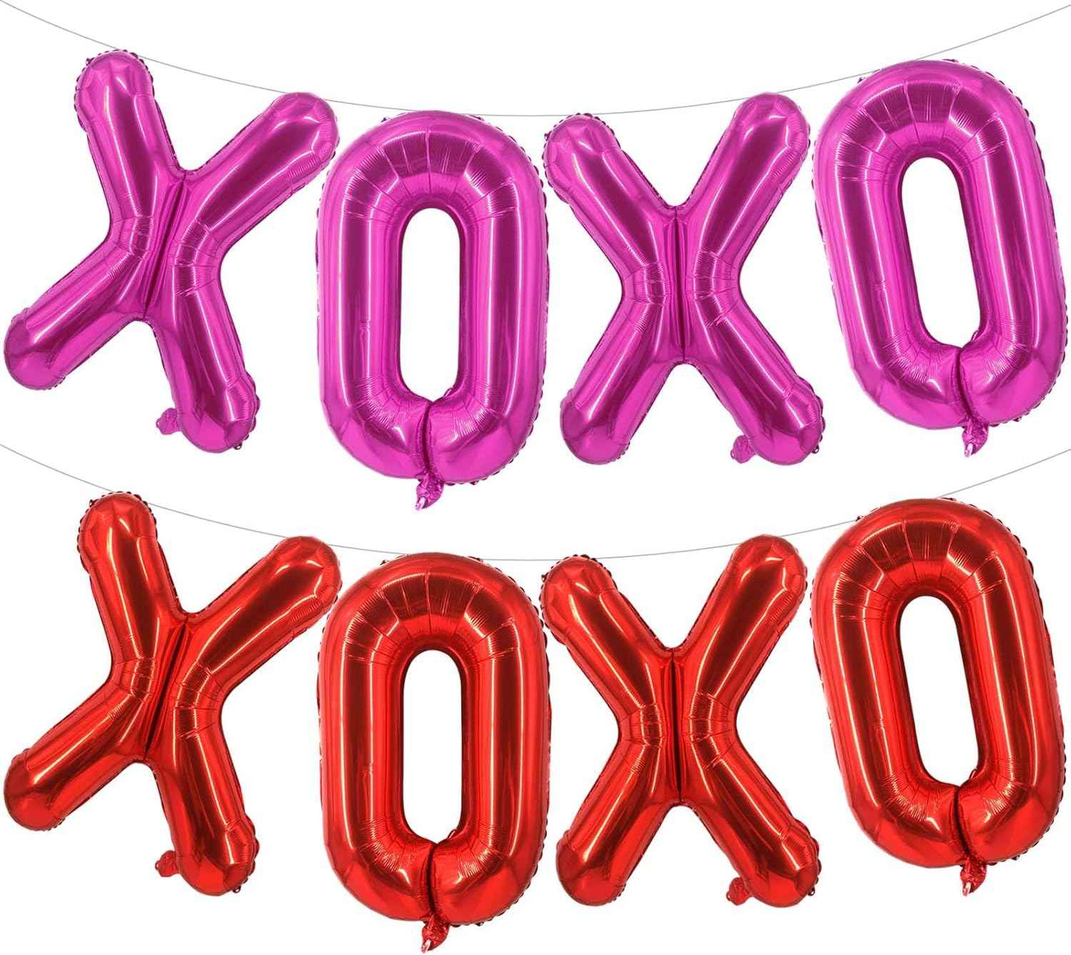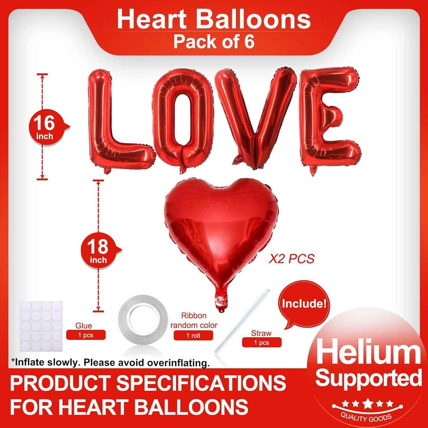 Package included:6 Pcs Valentine balloons(1 pcs 28*16 inch LOVE letter balloons+2 pcs 18 inch Red Heart Shaped Balloons)+1pcs straw+1pcs 32 foot Ribbon Roll+20 dots glue
