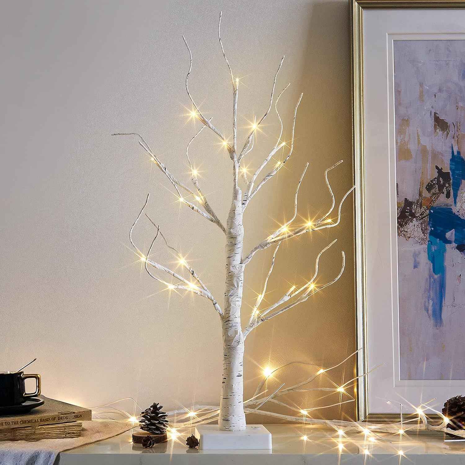 - Vanthylit White Birch Tree with LED Lights - Set of 2, Tabletop Tree with Timer, Christmas Decorations Lighted Tree for Indoor Mantel Home Decor (2 FT, 24 LED)