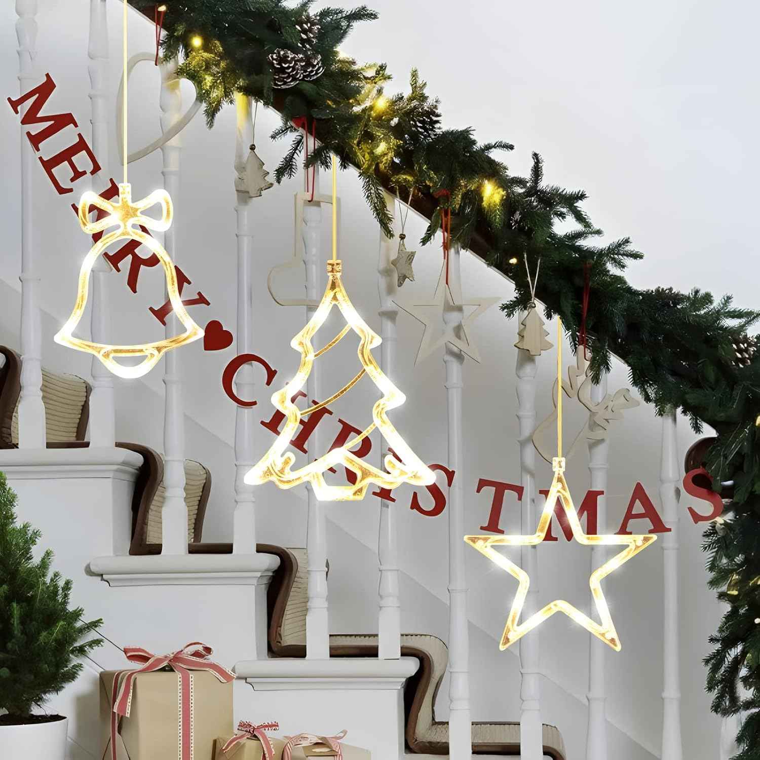 3Pack Christmas Window Lights Decorations with Timer, Battery Powered Hanging Warm White Lighted Tree Bell Star Shaped LED Sucker for Xmas Tree Fireplace Indoor Decor