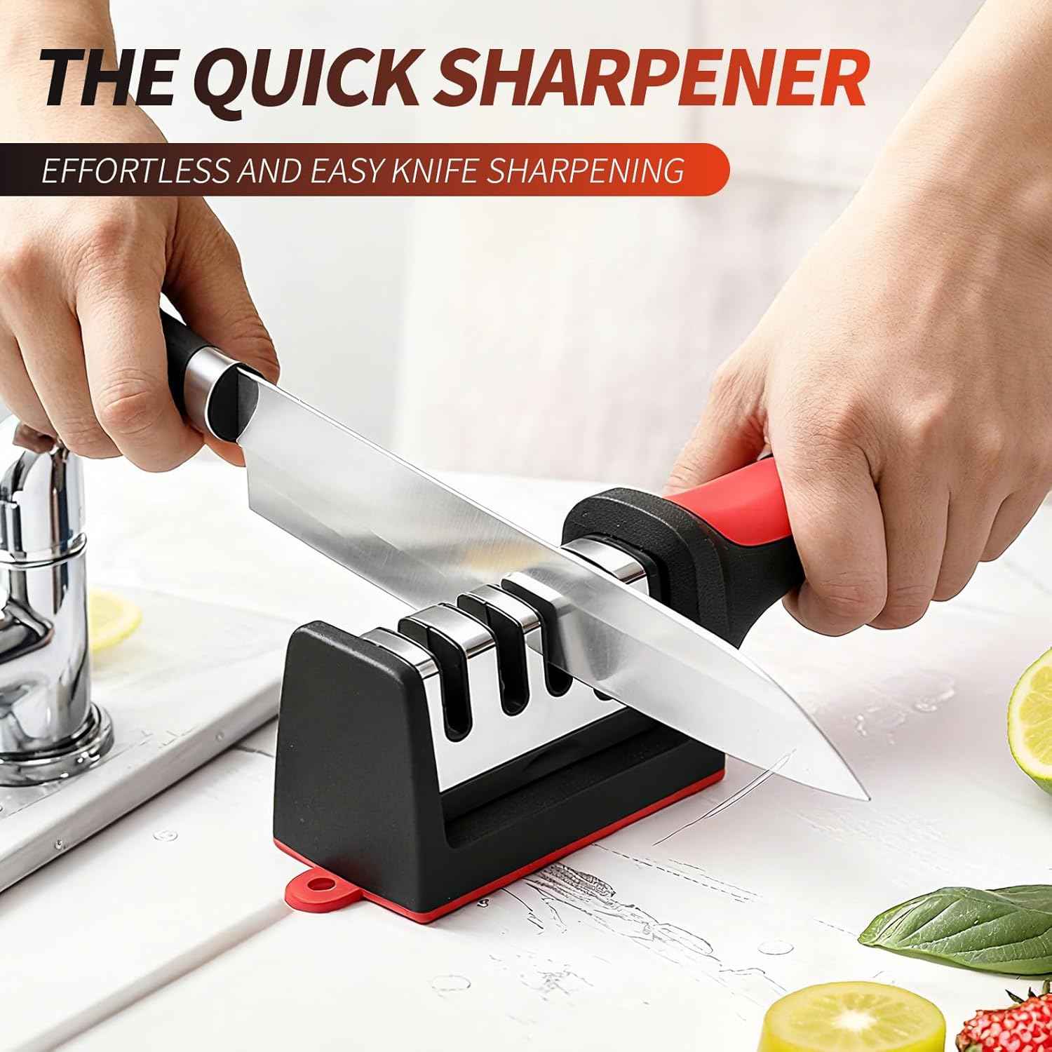 - 4-in-1 Kitchen Knife Sharpener, Professional Grade with Tungsten Steel and Ceramic Slots, Scissor Sharpening, Black/Red
