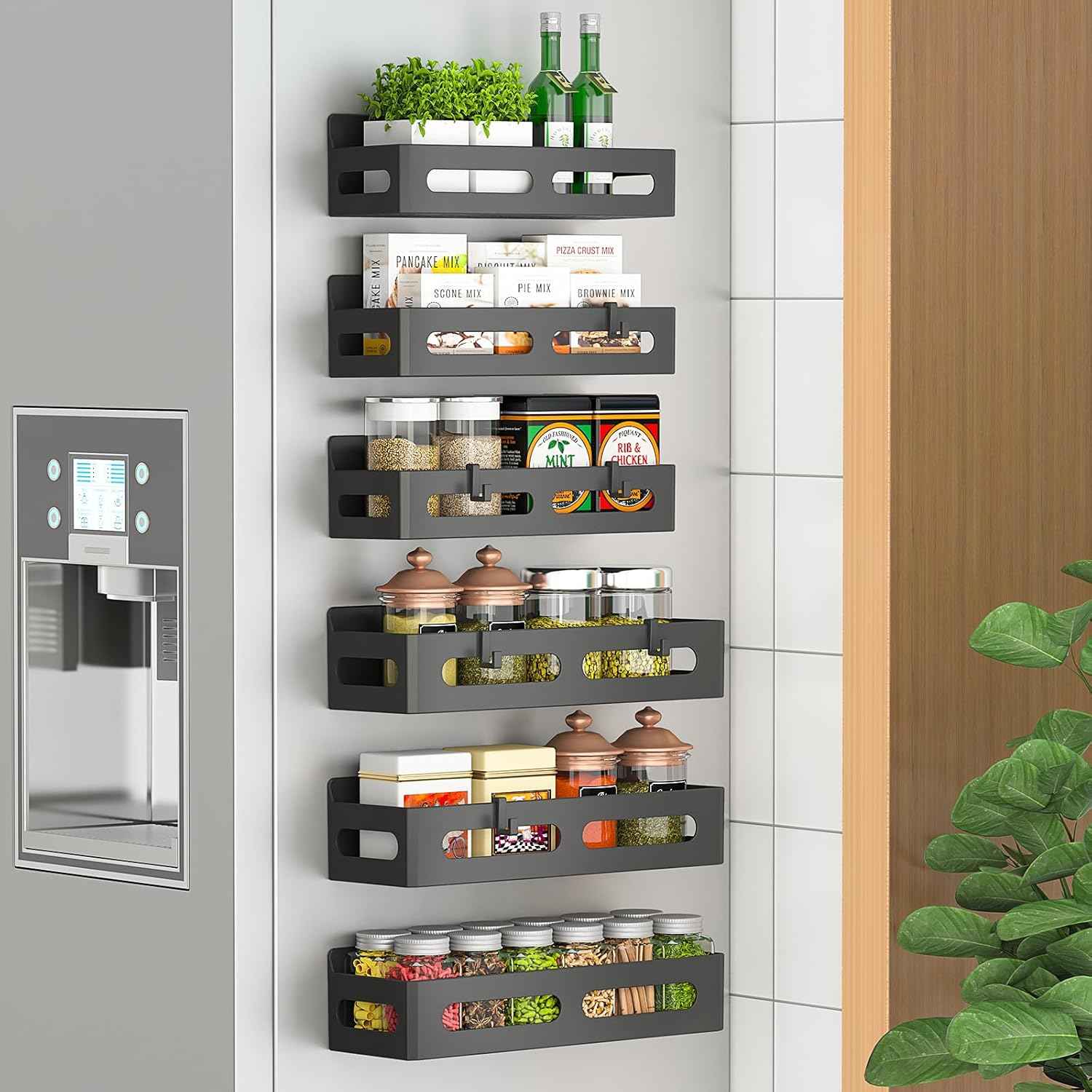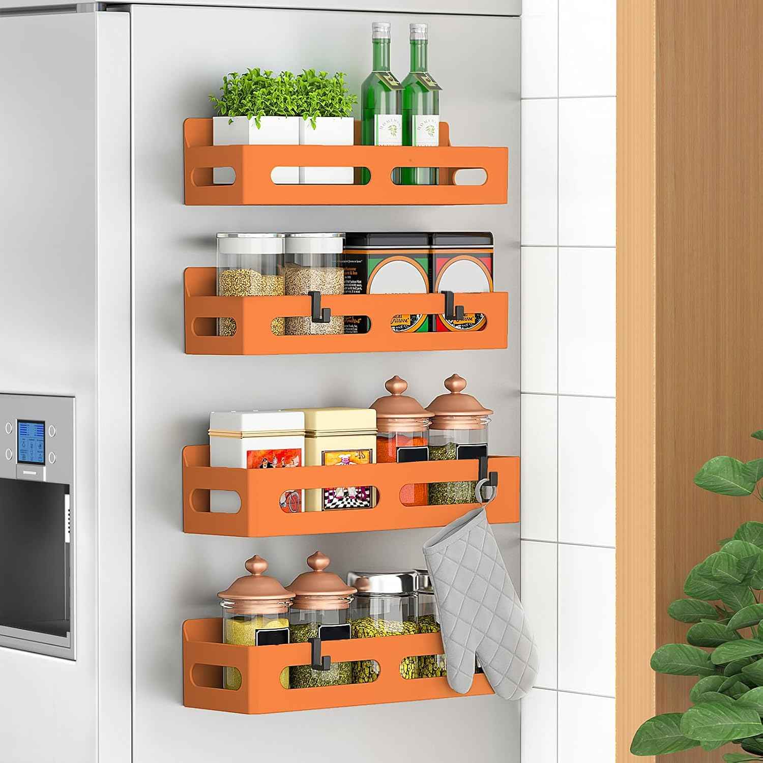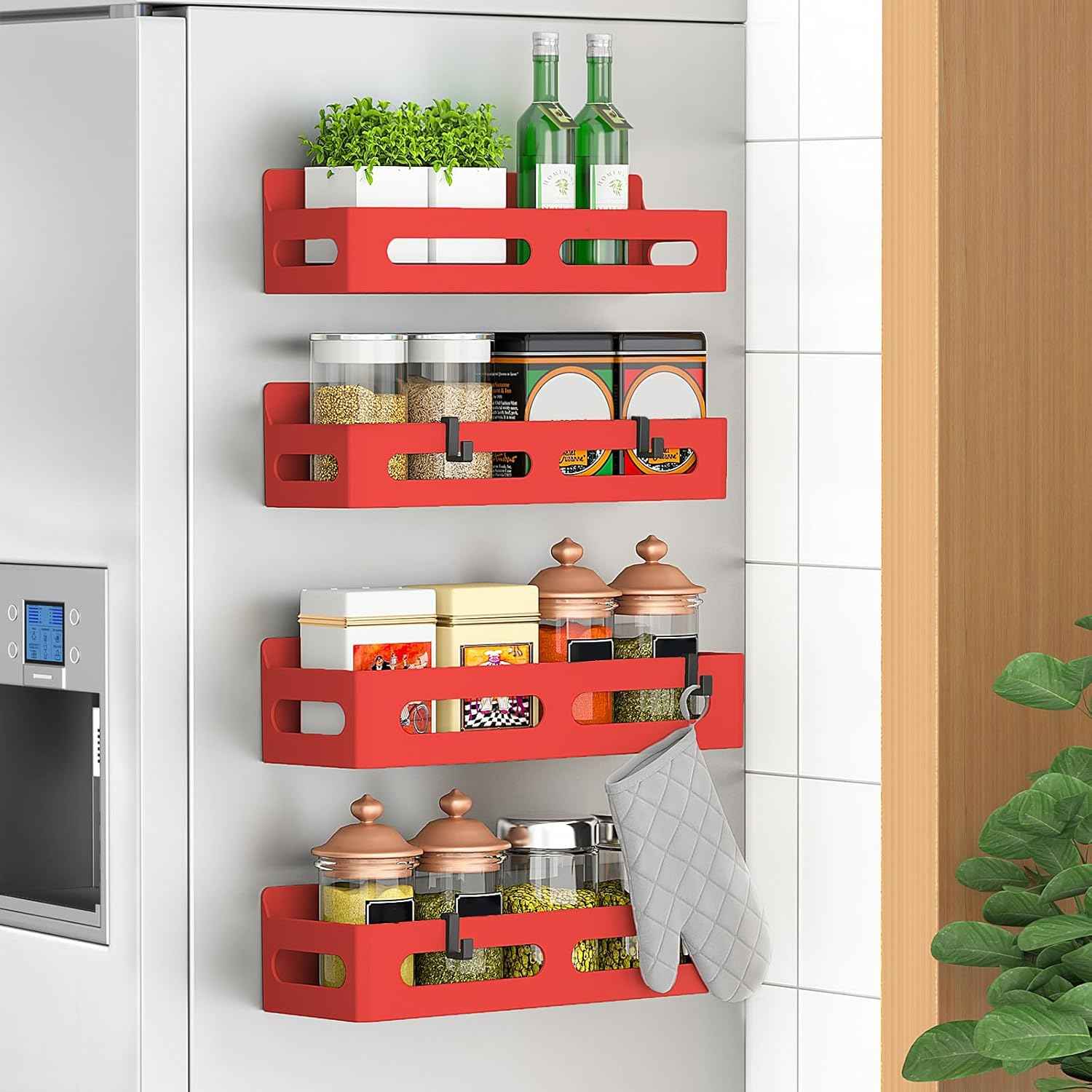 4 Pack Magnetic Spice Rack for Refrigerator, Spice Rack Organizer, Moveable Magnetic Shelf Fridge Organizer with 4 Hooks for Kitchen and Oven Organization, Black