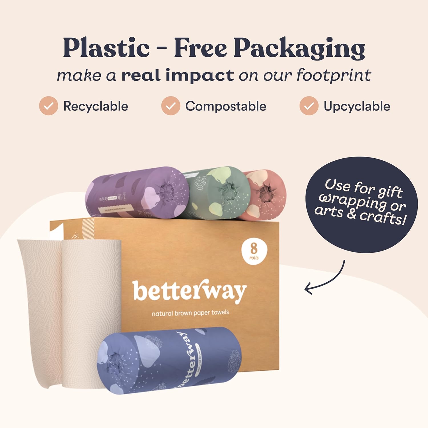 - Betterway Bamboo Natural Brown Paper Towels, 8 Rolls, 2-Ply, 110 Sheets Each, Plastic-Free Disposable Kitchen Towels
