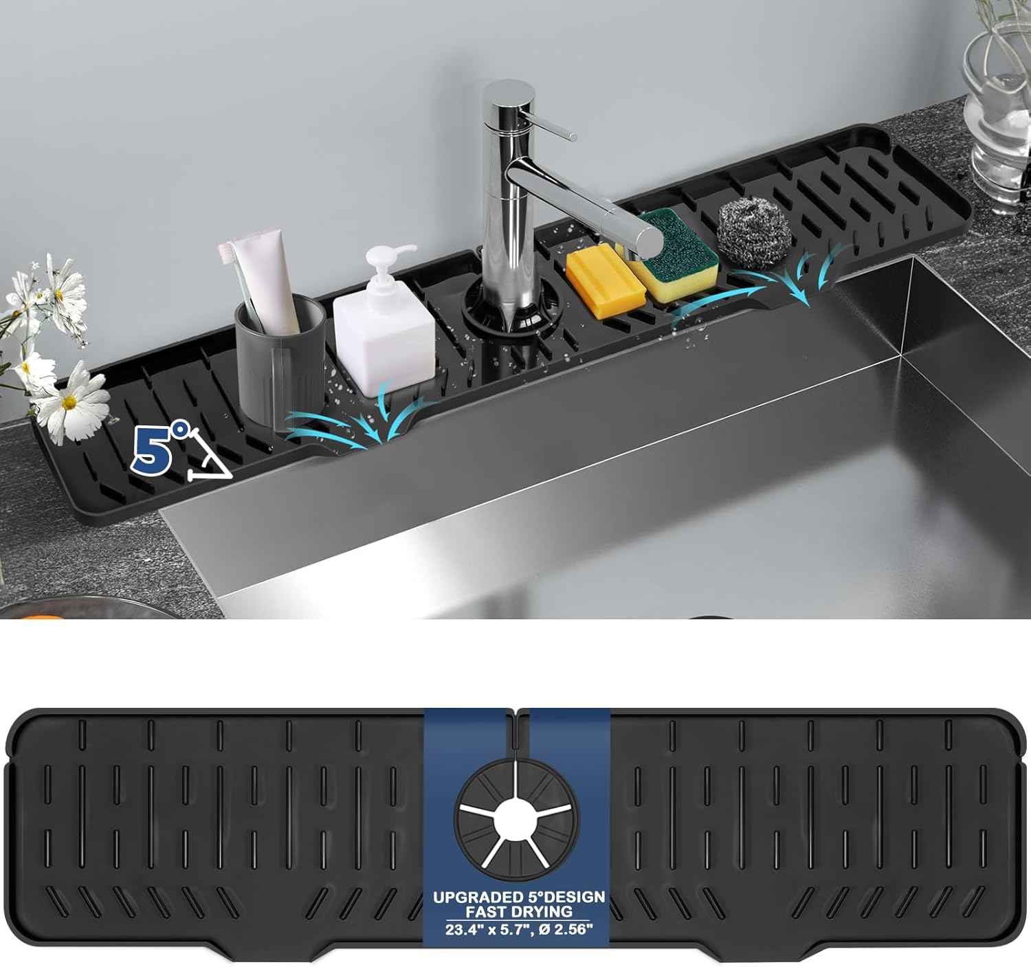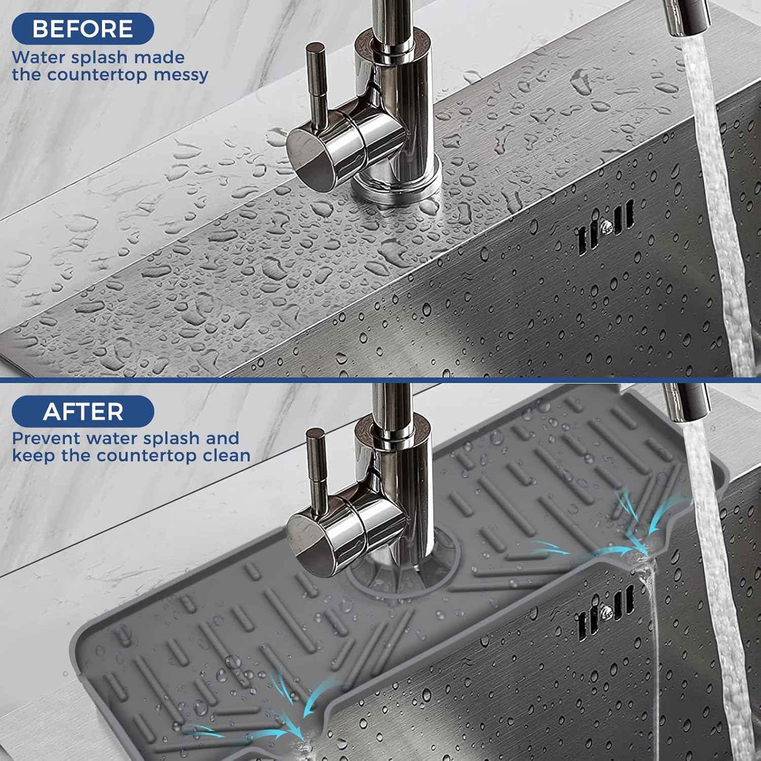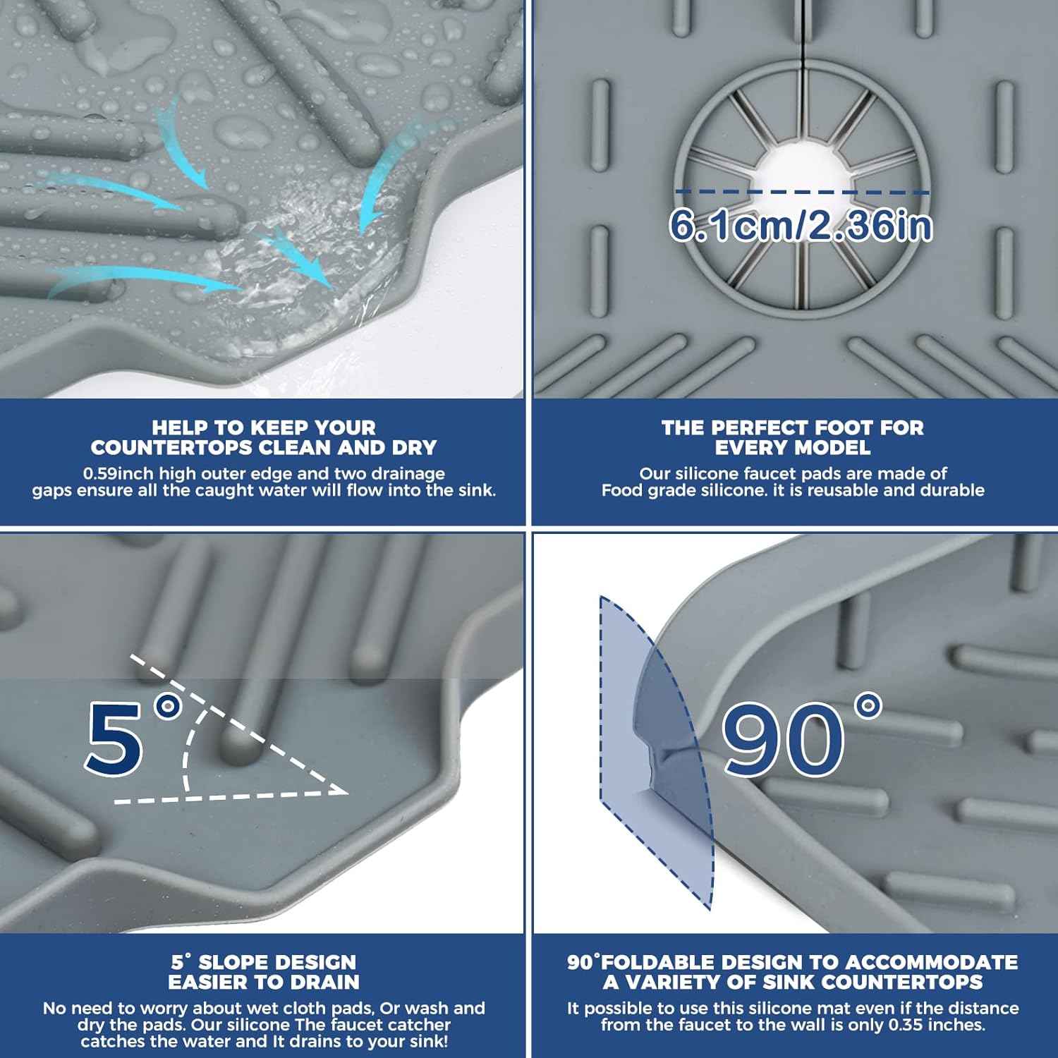 BFONS Silicone Faucet Handle Drip Catcher Drying Tray Mat Dish Soap Sponge Holder Accessories Gadgets for Kitchen Counter Bathroom Kitchen Sink Splash Guard -Grey