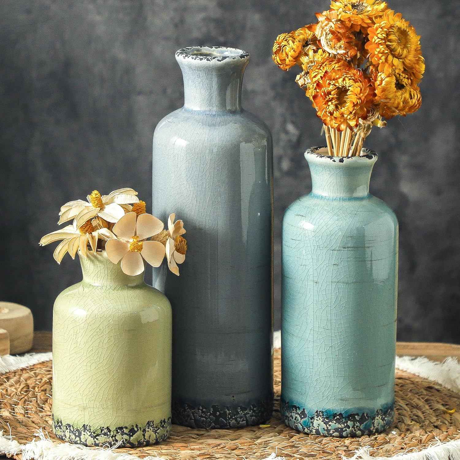 Ceramic Vase Set of 3, Neutral Flower Vases Home Decor, Pottery Rustic Farmhouse Decorative Vases Modern Decor for Table Mantel Entryway Bookshelf Living Room Kitchen Bedroom - Brown