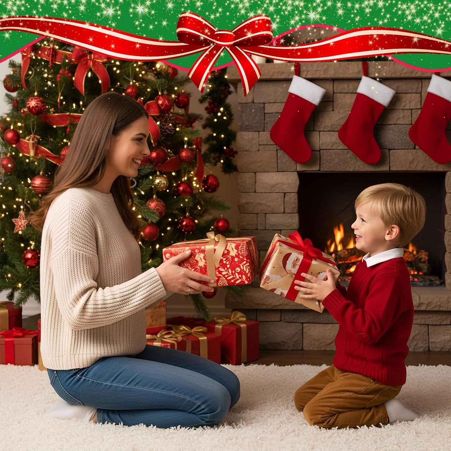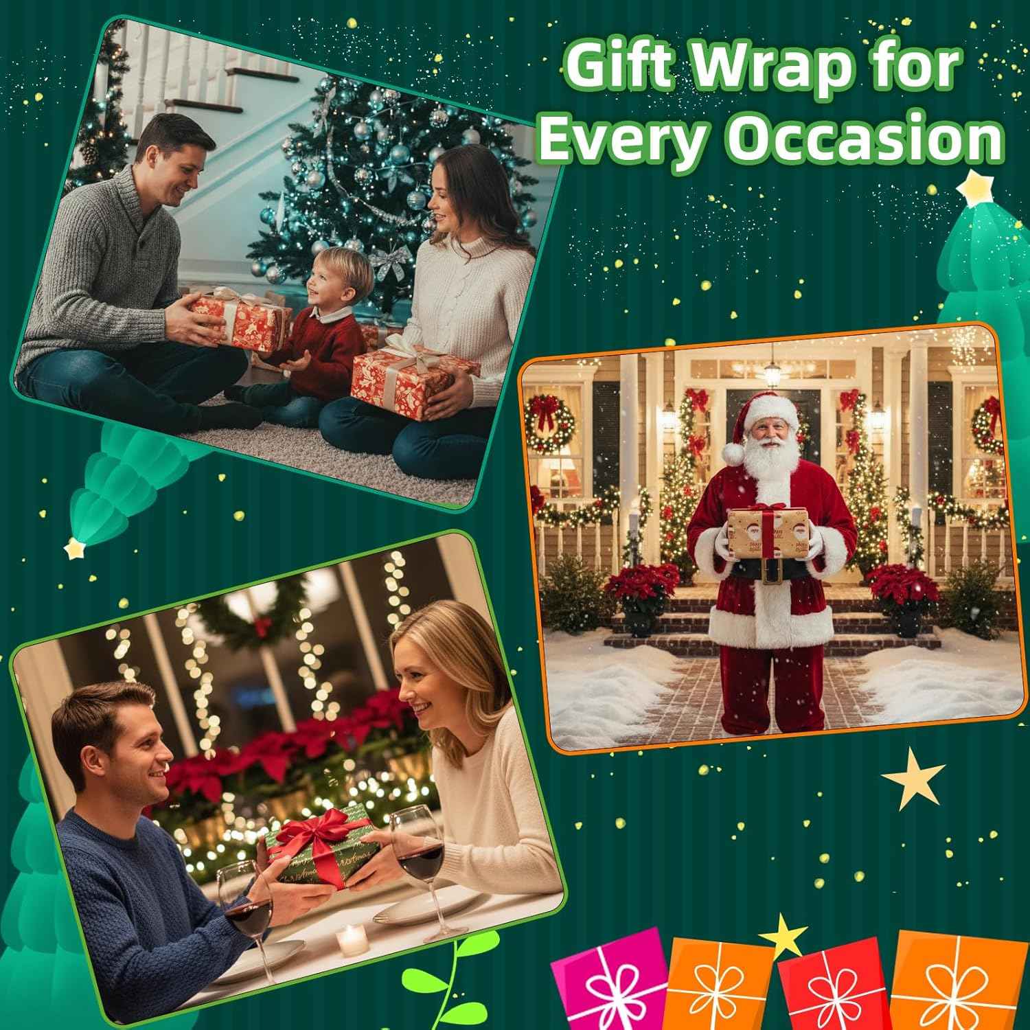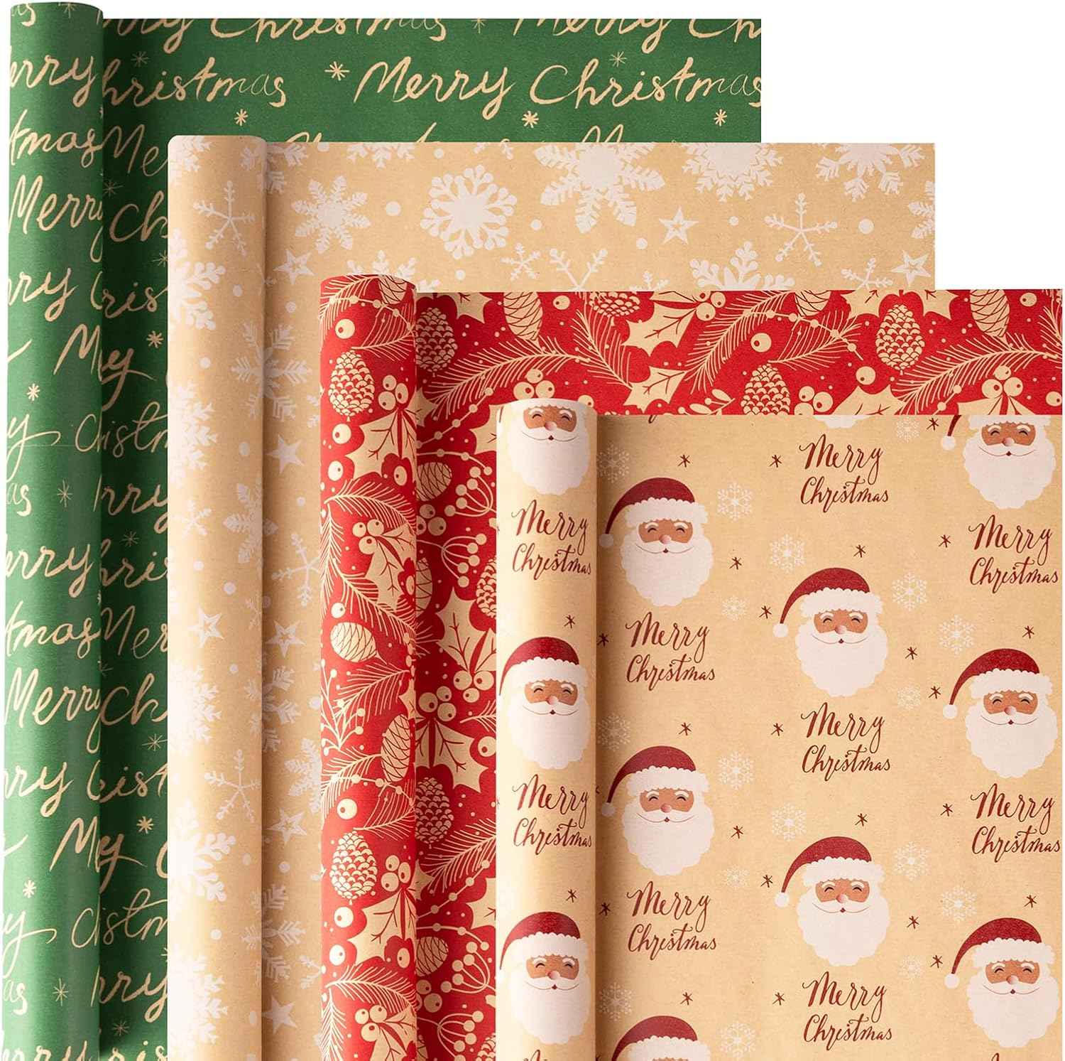 Christmas Kraft Wrapping Paper (4 Rolls, 93 sq. ft. ttl) Santa Claus, Snowflakes, Merry Christmas Script, Pinecones and Foliage Patterns for Holiday Gift Wrap - 17 Inches x 16.5 Feet Per Roll