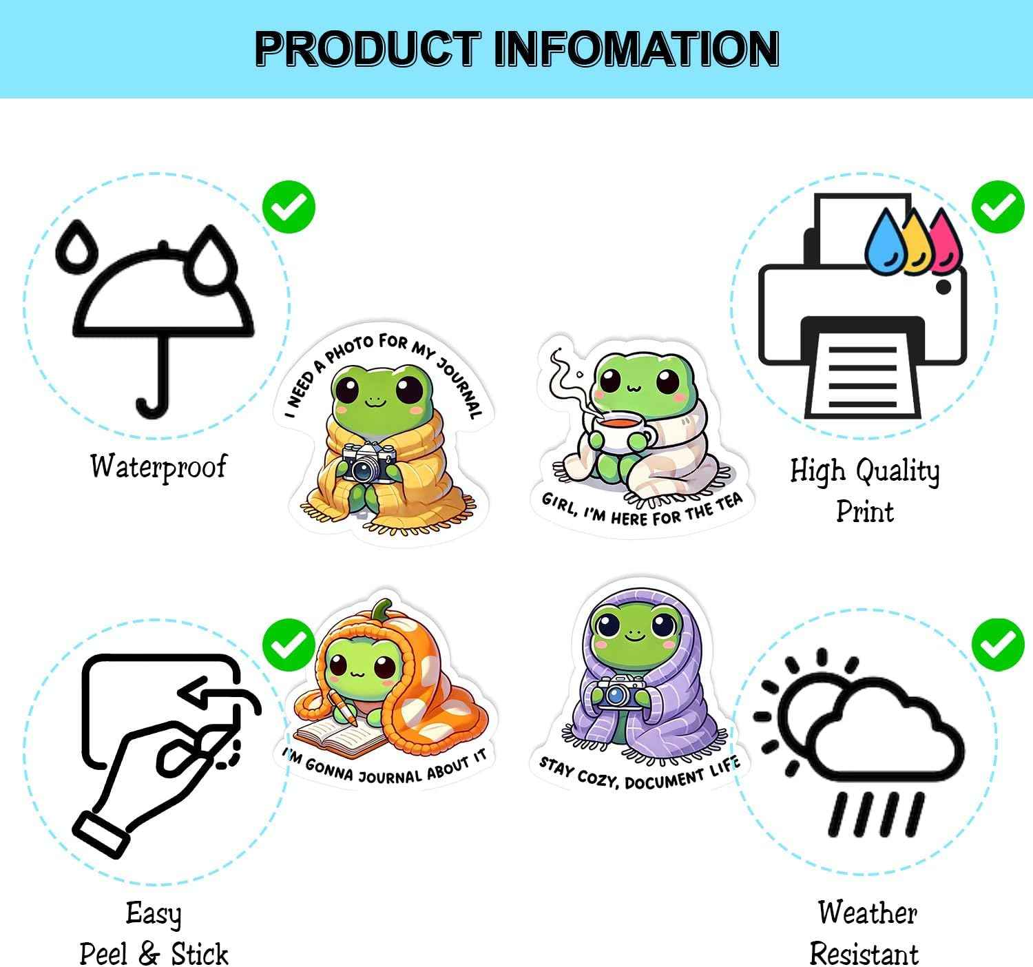 (4 Pack) Cozy Frog Stickers, 3" Cute Vinyl Decals for Journals, Tea Lovers, Laptops, Water Bottles, Scrapbooks & Gifting, Waterproof Aesthetic Sticker Set