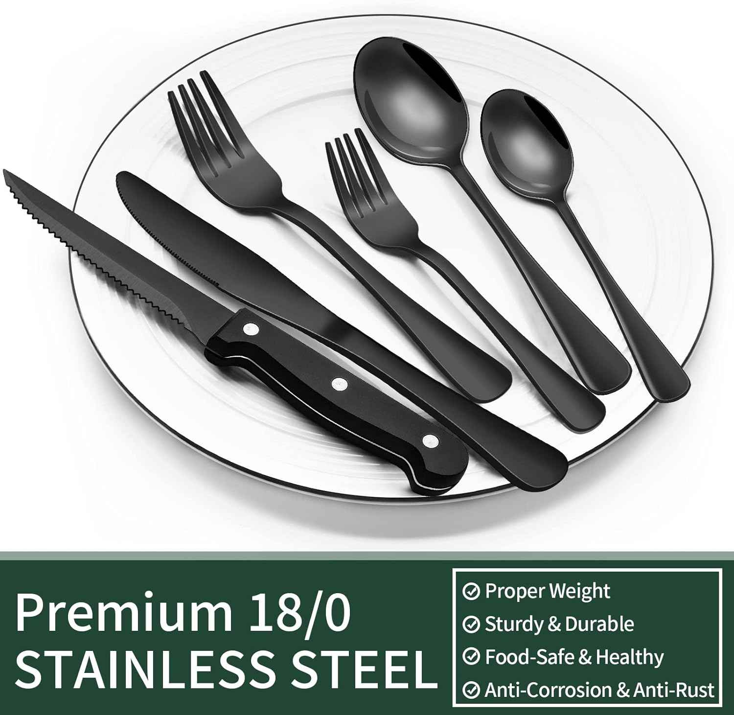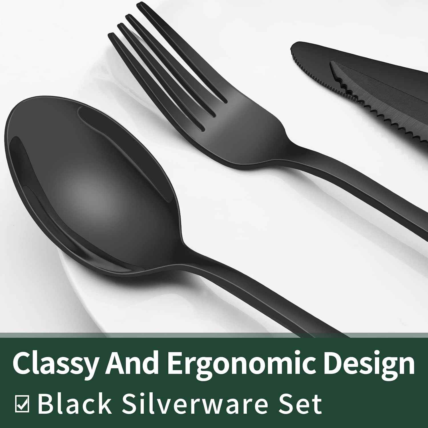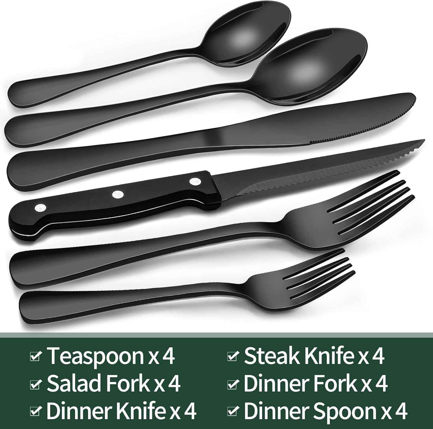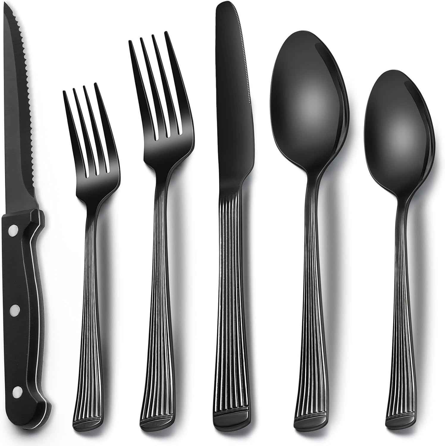 EWFEN 24-Piece Black Silverware Set with Steak Knives, Flatware for 4, Food-Grade Stainless Steel Tableware Cutlery Set, Mirror Finished Utensil Sets Home Restaurant