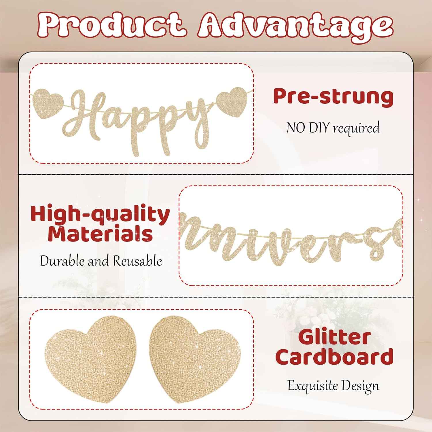 - Happy Anniversary Banner, Pre-Strung Gold Glitter Wedding Anniversary Decorations Romantic, Couples Shower Decorations Banner For Happy Wedding Reception Day Bridal Shower Party