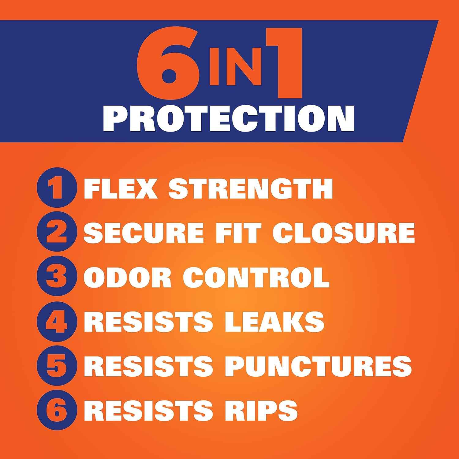 Trust Hefty Ultra Strong 13 Gallon Trash Bags to keep your kitchen waste contained—all the way from the can to the curb. Thanks to 6-in-1 Protection, these tall kitchen trash bags offer flexible strength, a secure closure, odor control technology, and resistance to leaks, punctures, and rips. The result is the highest protection you can get in flexible 13 gallon trash bags. Hefty’s stretchy strength means you don't have to worry about unexpected bag breakage and inconvenient messes when you use these tall kitchen garbage bags. A break-resistant grip drawstring makes it easy to close the bag and cart it away without incident. As a bonus, these tall trash bags include Arm and Hammer odor control technology and a Lavender and Sweet Vanilla scent to keep unpleasant smells at bay and keep your kitchen smelling fresh and clean. All Hefty trash bags are backed by a 100% satisfaction guarantee. **The ARM and HAMMER trademark is owned by Church and Dwight Co., Inc., and used by Reynolds Consumer Products LLC under license.