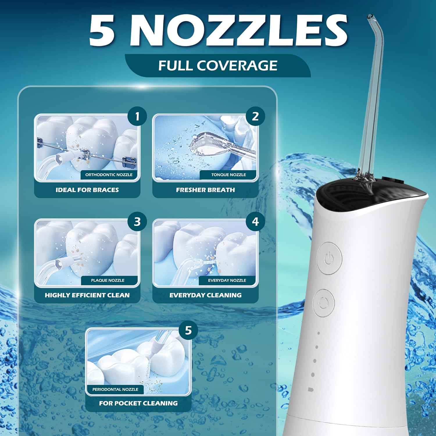 The tongue nozzle attachment on our water dental flosser pick is perfect for all users. It gently removes build-up and residue from the tongue, a key source of bad breath. Combined with precision water jets, it ensures a fresher, healthier tongue & mouth, complementing your orthodontic care routine