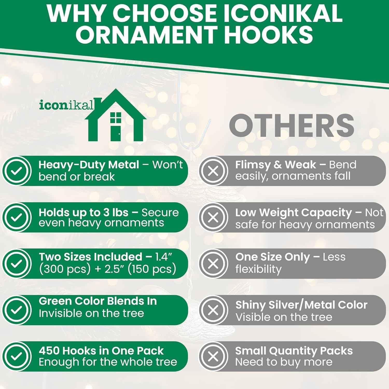 - Iconikal 450-Count Green Ornament Hooks Heavy Duty 1.4 & 2.5-Inch Christmas Tree Hangers for Large Small Decorations Blends with Tree Bulk Pack