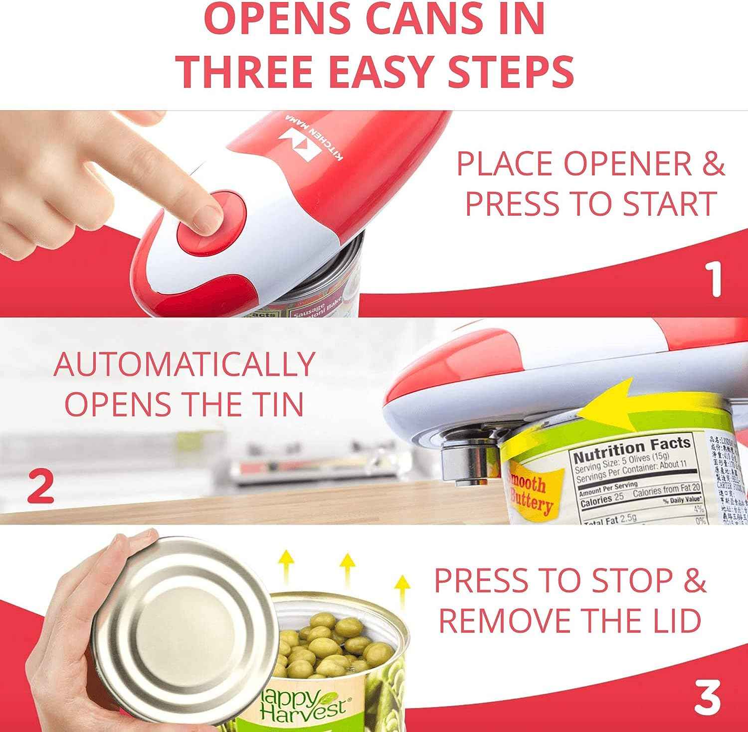 Designed to relieve unnecessary strain and provide convenience during meal preparation, the Kitchen Mama electric can opener makes opening tins as easy as 1, 2, 3.