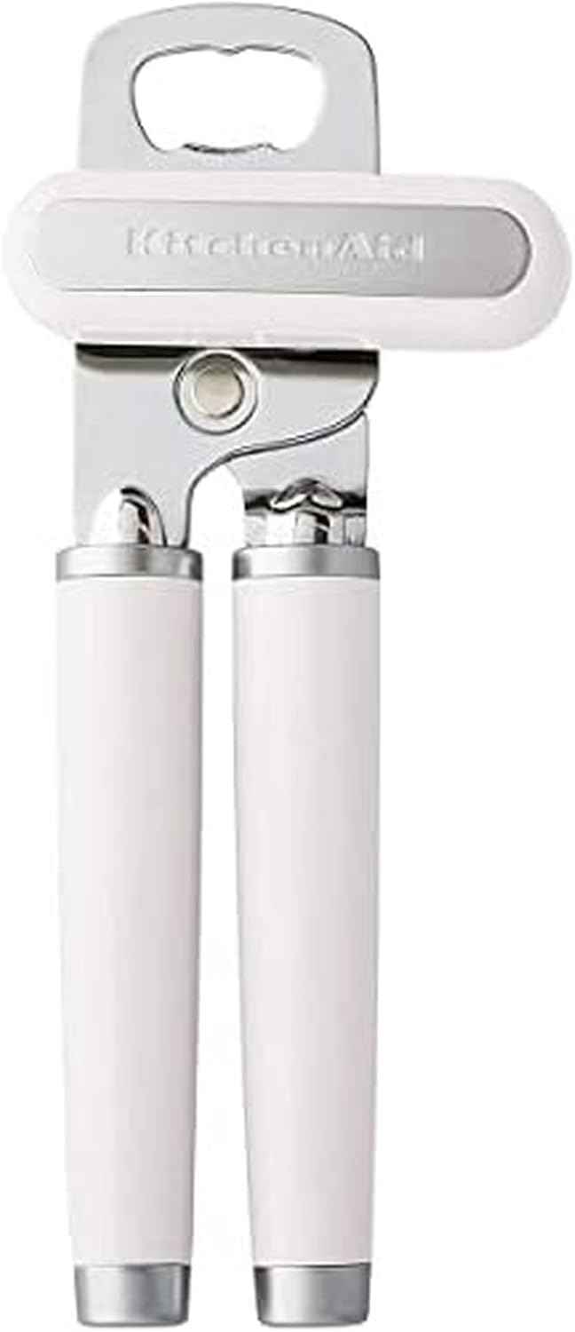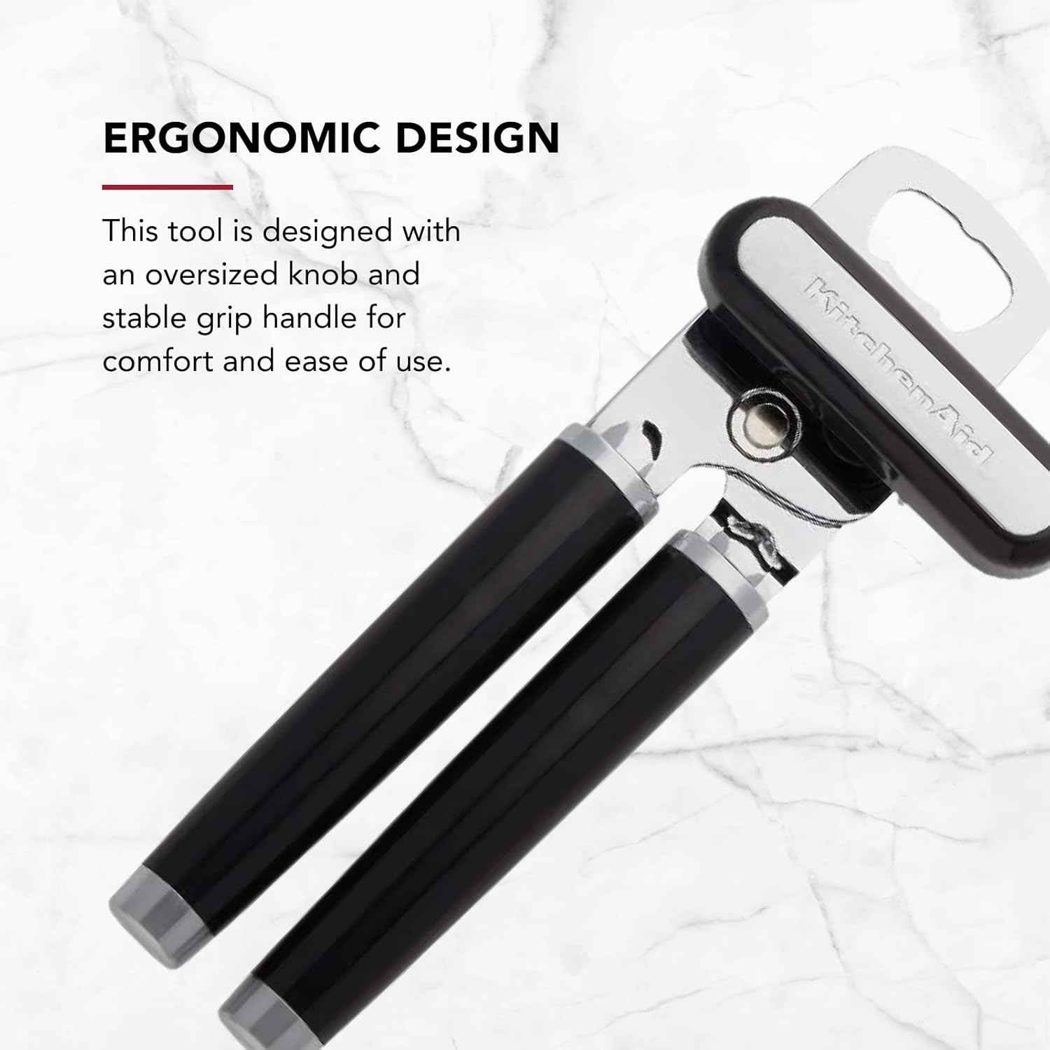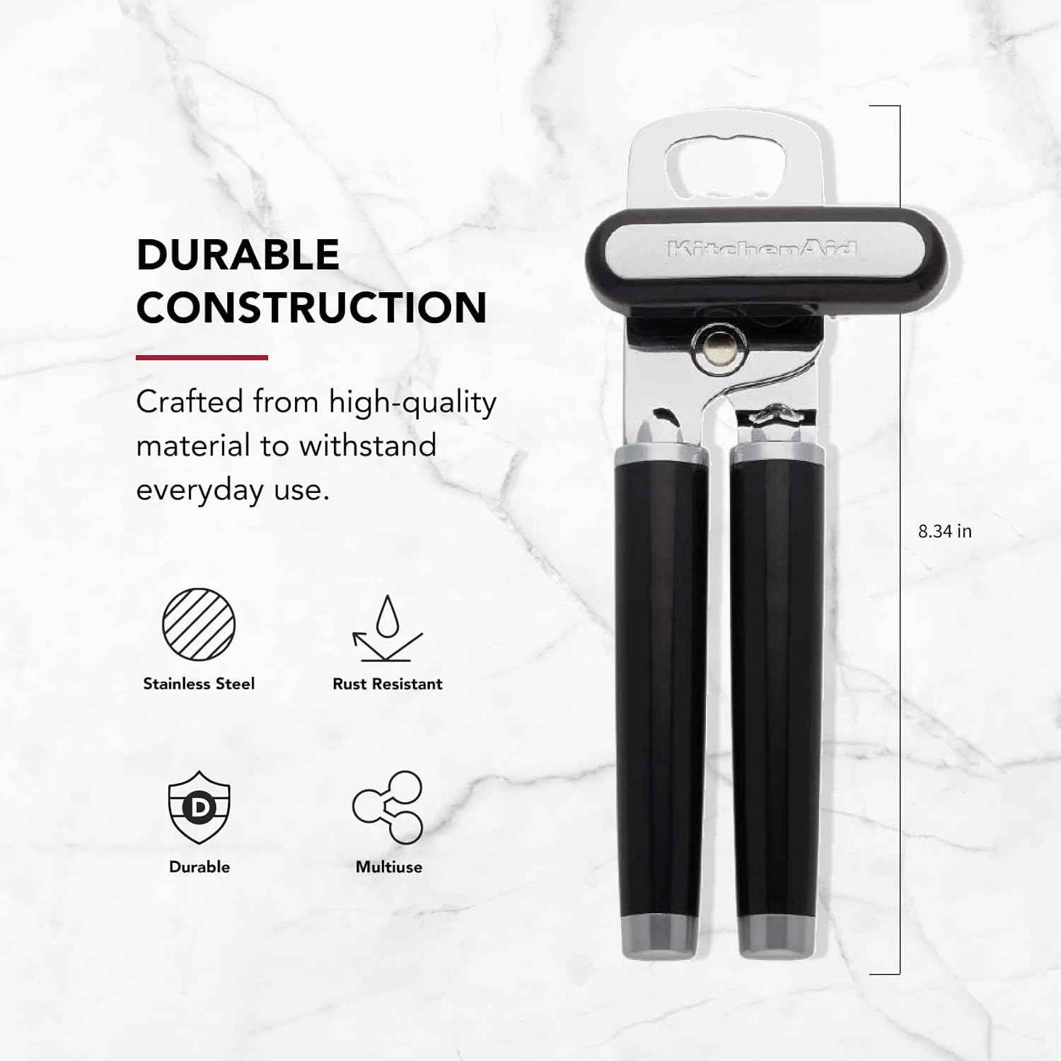 Open any sized can or bottle with the KitchenAid Classic Can Opener. The durable, razor-sharp stainless steel cutting wheel easily pierces and smoothly slices through cans, while the large knob provides a secure grip for effortless turning. The oversized, ergonomic handles provide maximum comfort and control for simple, safe use. This 2-in-1 tool features an integrated bottle opener to remove caps with ease. Hand wash with warm water and a mild detergent; rinse and dry immediately. One year hassle-free replacement and lifetime limited warranty.