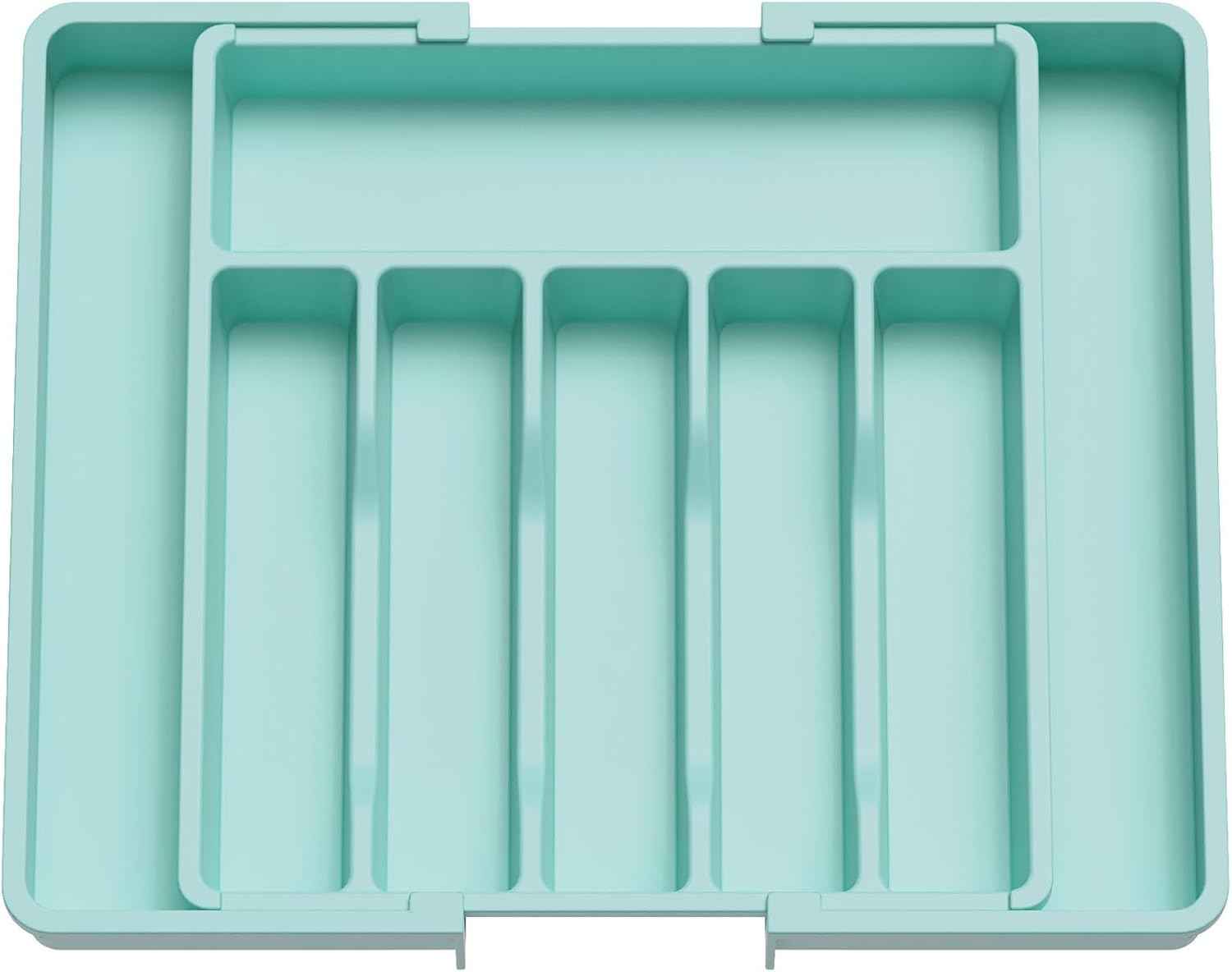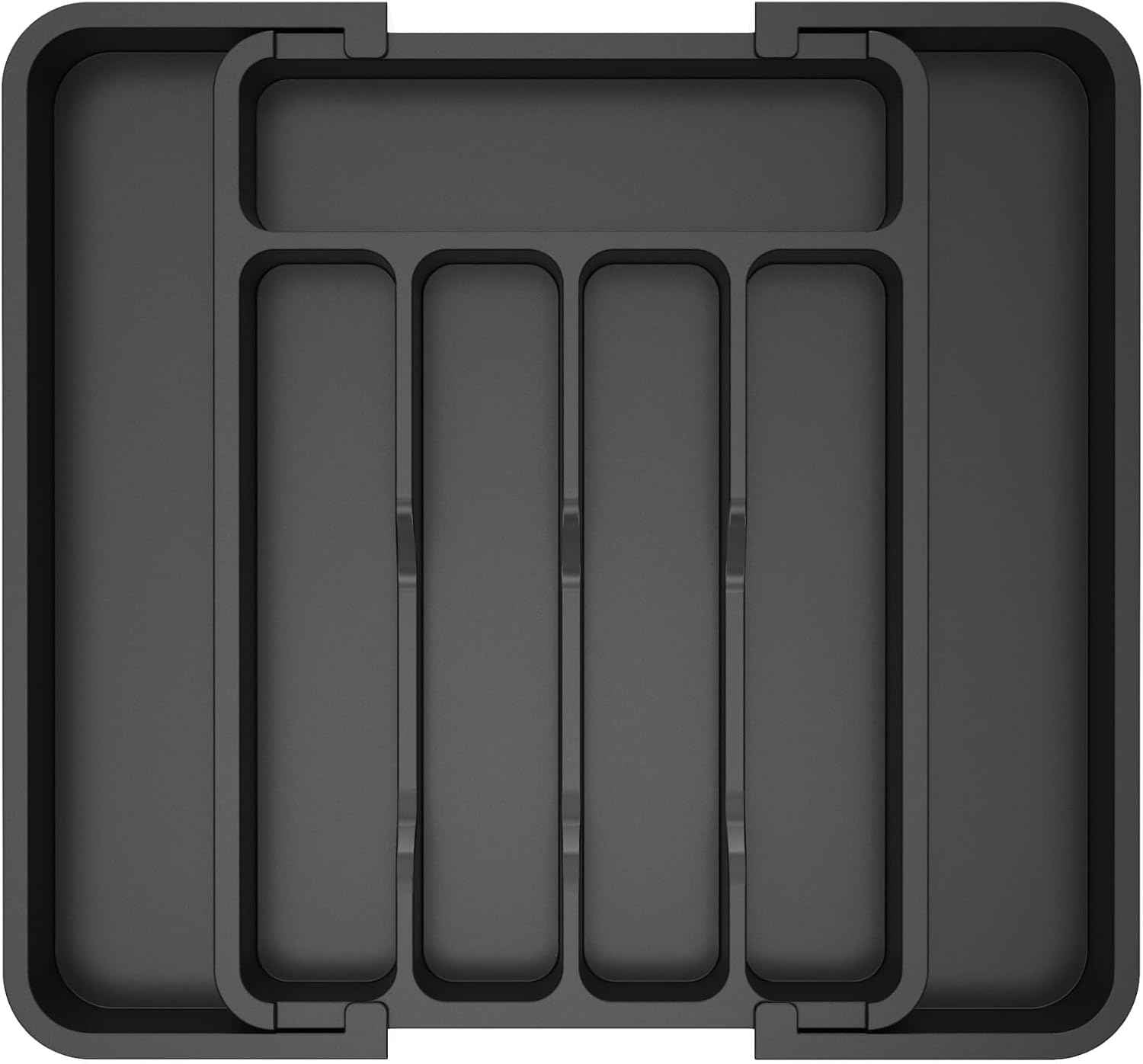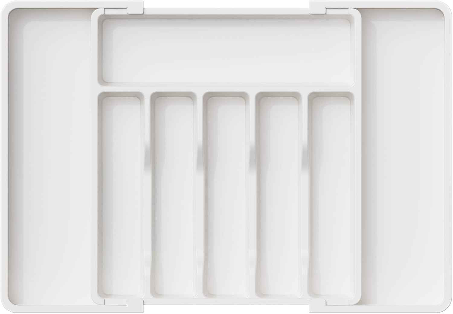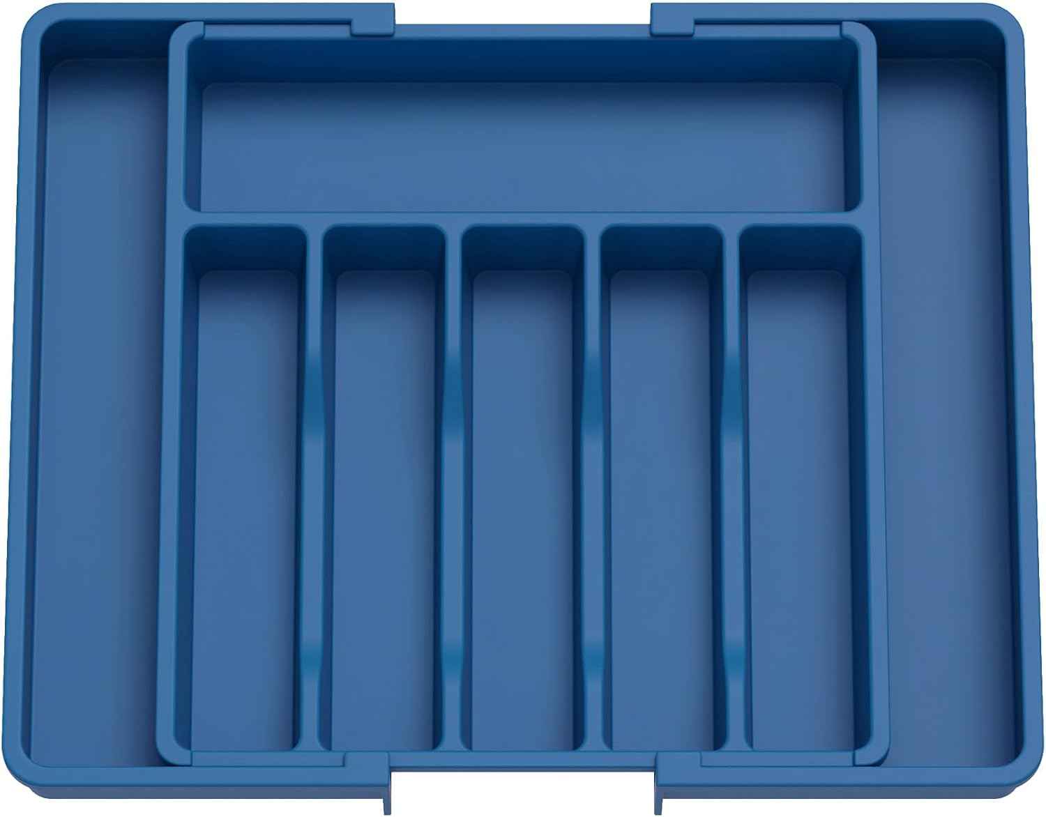 The silverware drawer organizer measures 22.4" x 15" x 2" and can be fully folded to 13" x 15" x 2". It is customizable and has 8 compartments for storing different sized flatware.