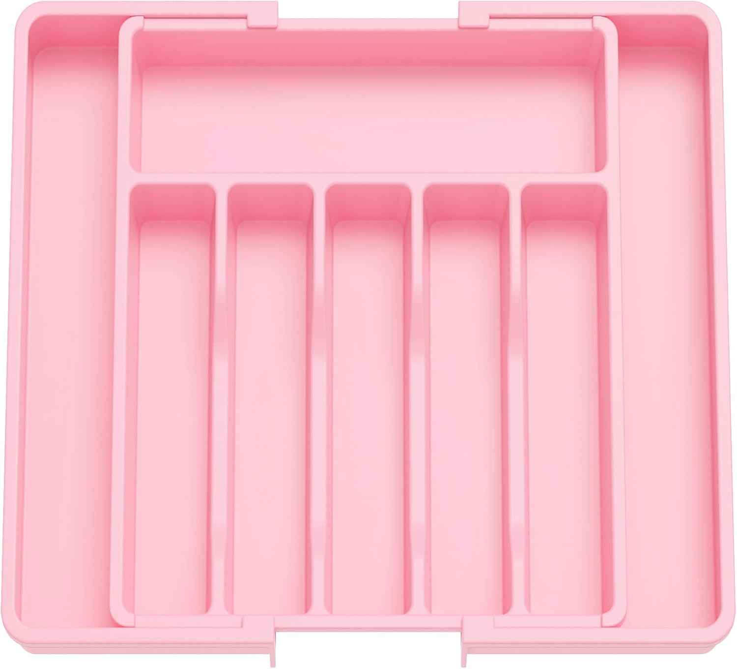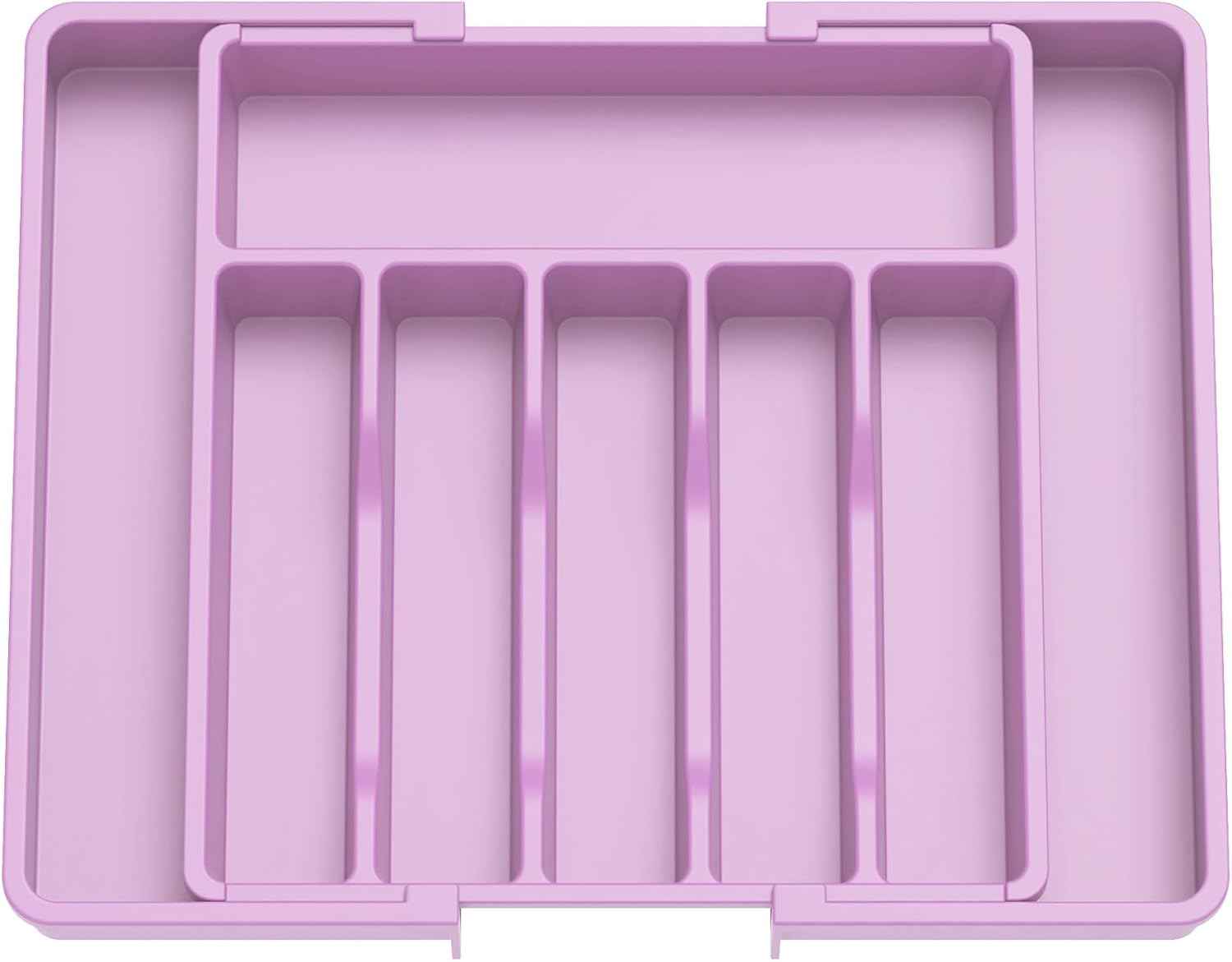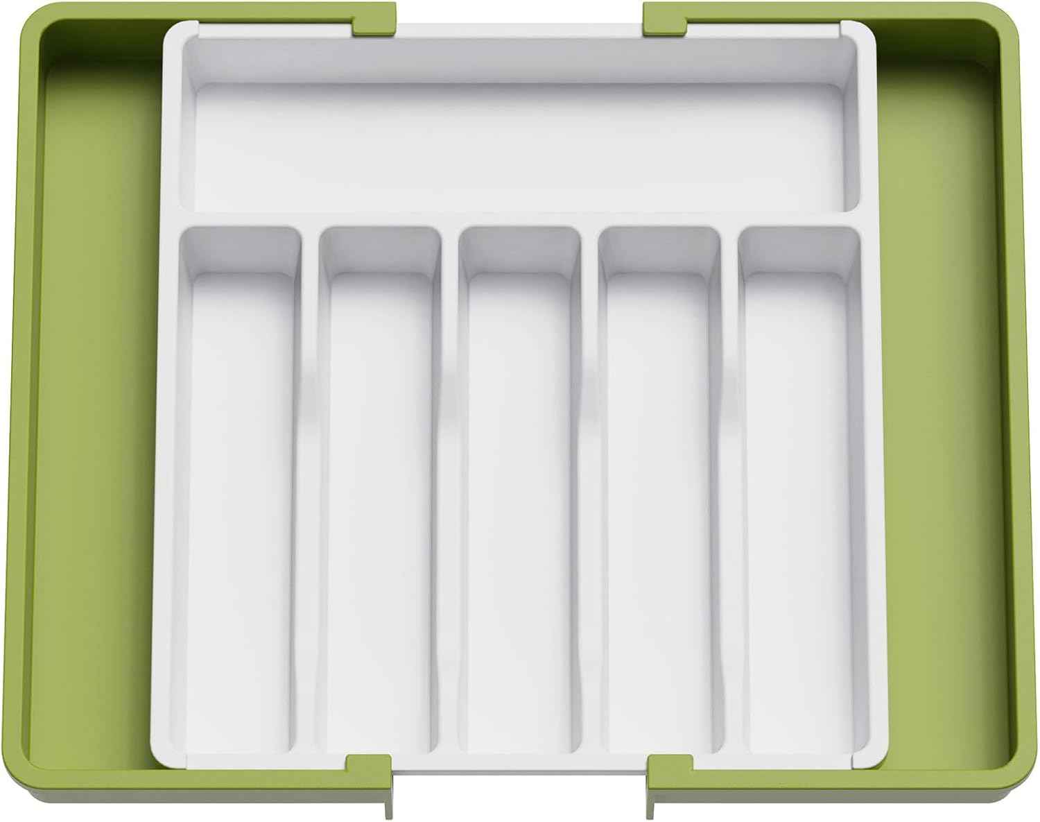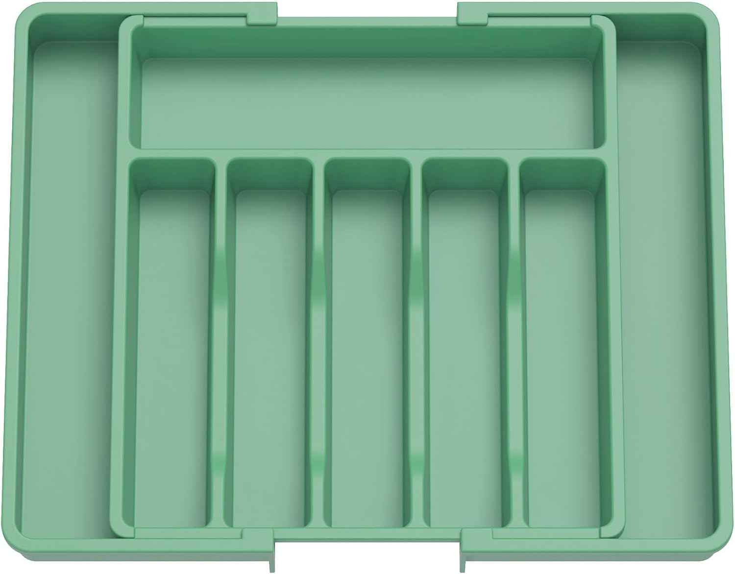 The silverware drawer organizer measures 22.4" x 15" x 2" and can be fully folded to 13" x 15" x 2". It is customizable and has 8 compartments for storing different sized flatware.