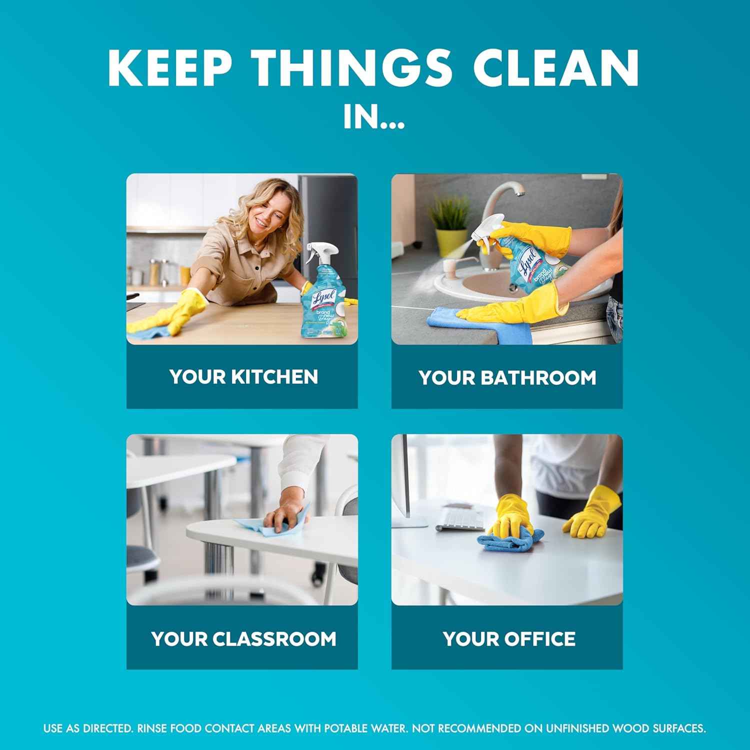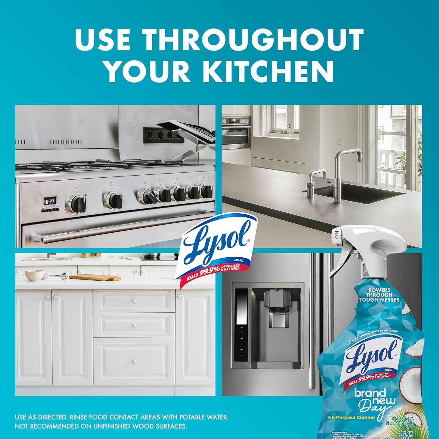 Lysol All Purpose Cleaner Spray kills 99.9% of viruses & bacteria* and powers through soap scum & tough grease — so you can clean, sanitize, & disinfect in one go. From kitchens to bathrooms to common household areas, Lysol Brand New Day™ All Purpose Cleaner is a disinfectant spray that kills 99.9% of germs* and leaves a Coconut & Sea Minerals fragrance that you'll love. Lysol multipurpose cleaner can be used on hard, non-porous surfaces throughout your household such as counters, sinks, stovetops², cabinets, appliance exteriors, high chairs, bathtubs, and showers. *When used as directed. Kills 99.9% of Salmonella enterica, Escherichia coli O157:H7, Staphylococcus aureus, Avian Influenza A (H1N1) Virus and Herpes Simplex Virus Type 1 & 2 on hard, non-porous surfaces in 2 minutes. Kills 99.9% of Klebsiella pneumoniae and Staphylococcus aureus on hard, non-porous non-food contact surfaces in 10 seconds. ²At room temperature. ³No chlorine bleach.
