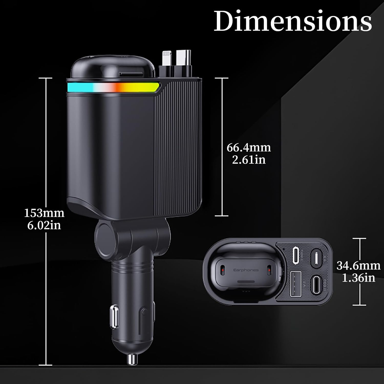 The MLVOC 120W Fast Charging Car Charger is a fully loaded, space-saving solution for powering multiple devices on the road. Equipped with a retractable 4-in-1 charging cable that supports both USB-C and Lightning devices, plus integrated wireless earbuds, this compact charger eliminates cable clutter and keeps your essentials ready to use. Designed for commuters, rideshare drivers, and road-trip travelers, it delivers stable, high-speed power while providing convenient hands-free audio.