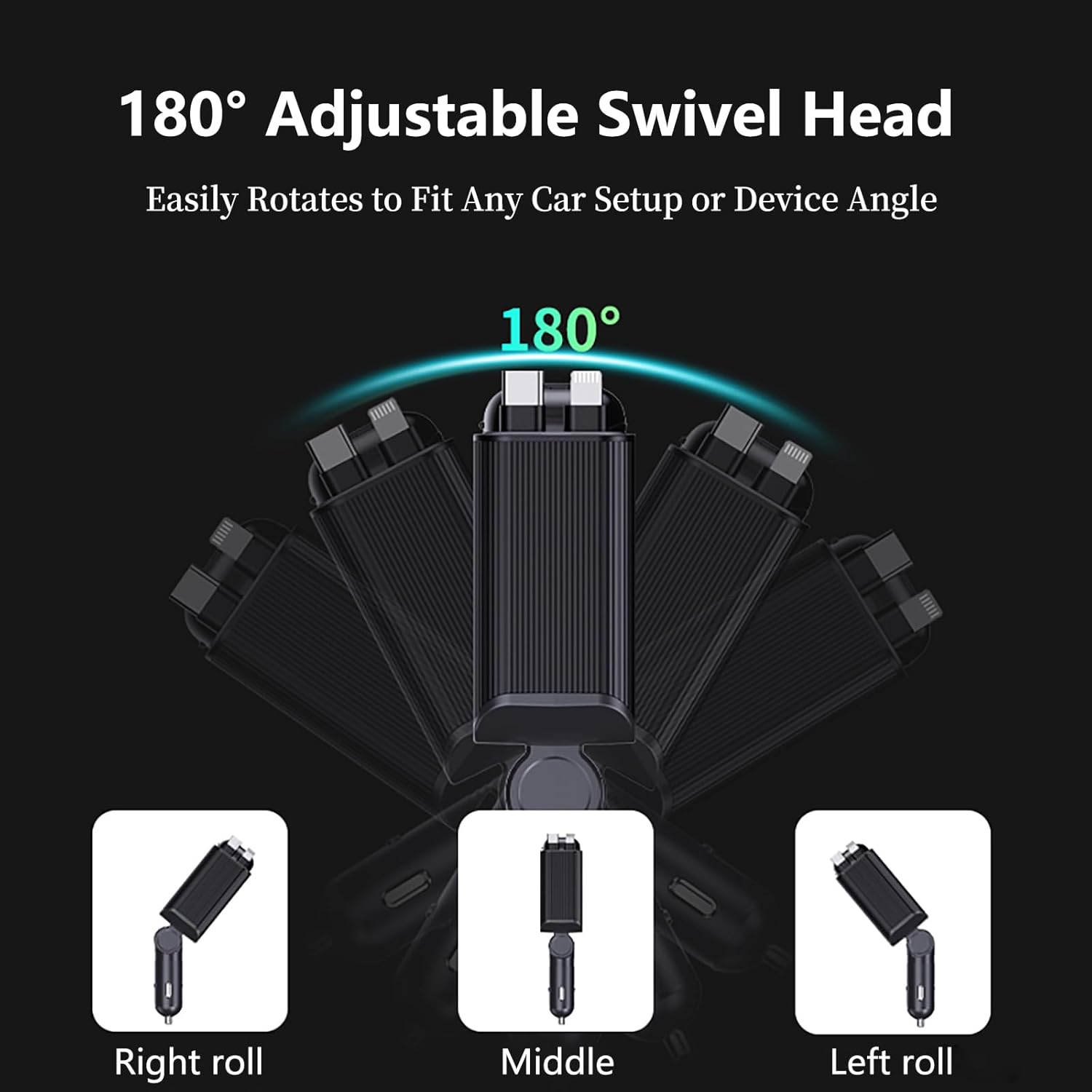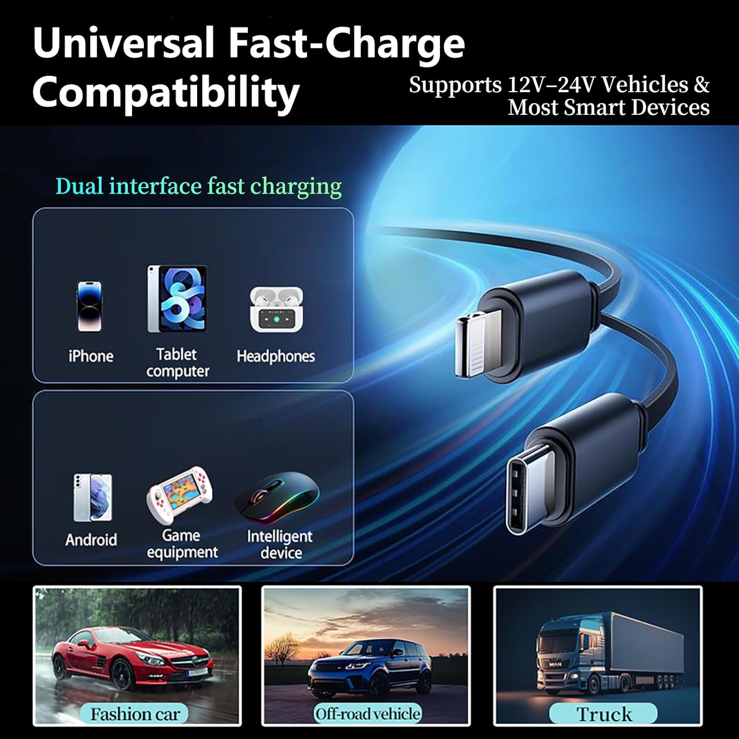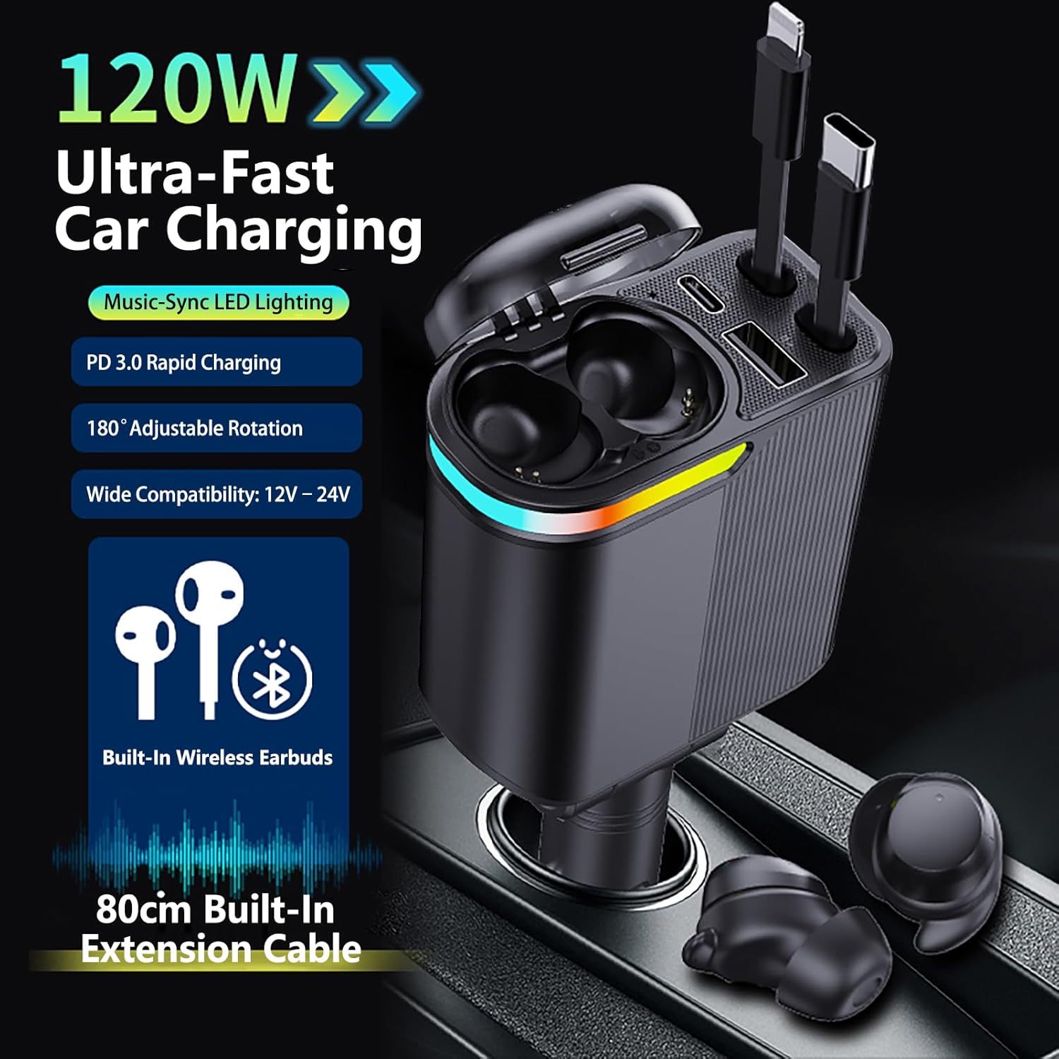 - MLVOC 120W Fast Car Charger with Built-In Earbuds – Retractable 4-in-1 USB-C & Lightning Cable for iPhone & Android Devices