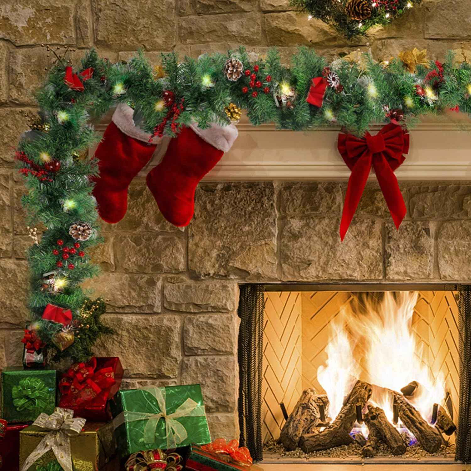 MorTime 9 FT LED Christmas Garland with Pinecones Red Berries Bows Christmas Balls Candies, Multi-Function Christmas Garland with 50 Warm White LED Lights, 180 Branch Tips