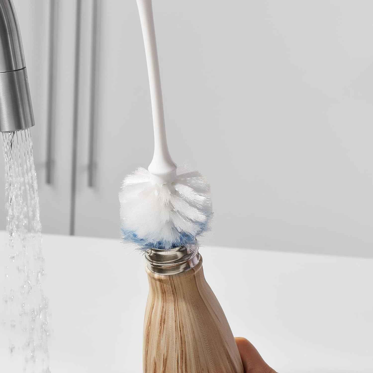 The OXO Bottle Brush delivers versatile cleaning power for a wide range of kitchen tasks. A dual-function bristle head combines gentle bristles for glassware and bottles with stiffer bristles for scrubbing tougher residues in pitchers, carafes and other narrow containers. The long, flexible neck reaches deep inside bottles and tight spaces that ordinary cleaning brushes can’t access. Durable nylon bristles act as a reliable dish scrubber for everyday messes, while the angled head helps you scrub efficiently. A soft, non-slip handle stays comfortable and secure, even when wet, so you can clean with confidence. Safe for stemware, pots, pans, bottles and delicate containers, this brush is an essential part of your everyday cleaning supplies. Dishwasher safe for easy cleanup, the OXO Bottle Brush fits neatly in a sink caddy or hangs from the handle hole for convenient storage. Use it as a bottle brush, general kitchen scrub brush or cleaning tool—it’s built to last and designed to make cleanup simple.