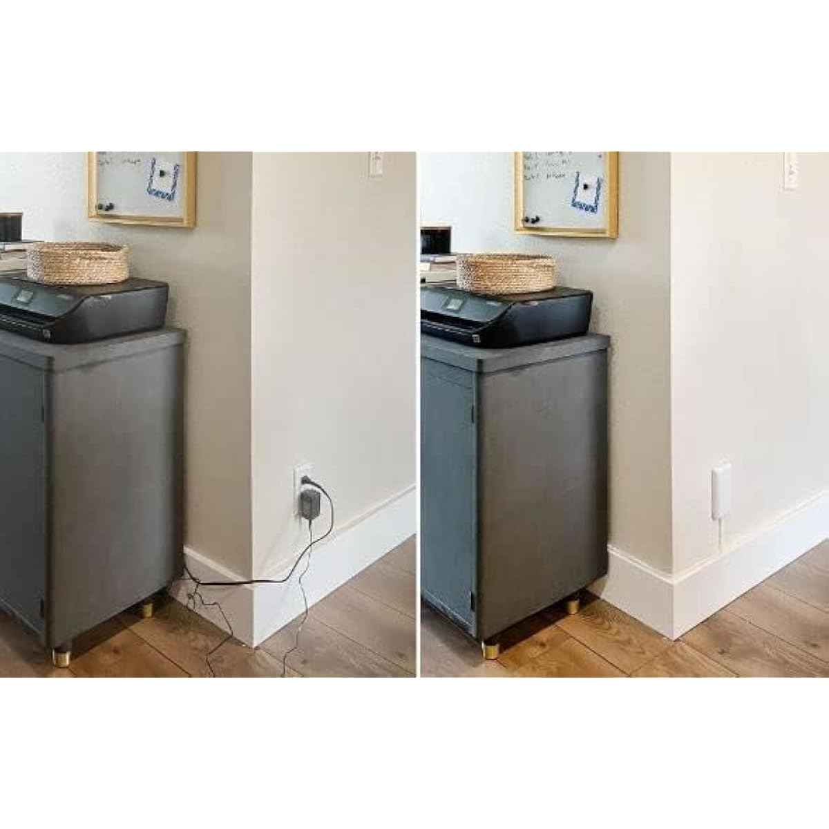 Sleek Socket exists to turn a small change into a big impact! This innovative home improvement outlet concealer is perfect for anyone looking to enhance their living spaces with less clutter while also getting more out of their outlets. Our device works similar to outlet covers, an outlet extender, or a flat extension cord with multiple outlets, but it's so much more. Use more of your room! Sleek Socket is up to 90% thinner than traditional plugs & cords and thinner than most baseboards. Sofas, tables and entertainment centers can now sit flush against the wall. Sleek socket fits all standard duplex outlet sizes, providing a seamless, low-profile solution for managing multiple cords. The 3-foot flat cord is ideal for kitchens, small or tight spots, and behind furniture, offering an elegant and practical way to eliminate clutter. Also included are double-sided adhesive strips and cord clips, ensuring your cords stay securely fastened to the wall. This not only enhances the aesthetic of your space but also the functionality and organization. The Sleek Socket is designed to blend seamlessly with your decor, making it a perfect addition to any room. It's also perfect for anyone looking to streamline their setup, this outlet cover with extension cord is a must-have for any home improvement project. It’s not just about functionality; it’s about enhancing the aesthetics of your home while ensuring that your electrical setup is both efficient and safe. Universally compatible with all of a "standard" size outlet cover, "mid-size" outlet cover and "oversize" outlet cover, the Sleek Socket makes every room of your home look organized and efficient. Technical specifications: 3 foot extension cord, 3 outlet power strips. Maximum amps: 13; Maximum volts: 125; Maximum watts: 1625 Safety Certifications: This Sleek Socket product is certified as specifically complying with UL Standard 817 (Safety Cord Sets and Power-Supply Cords). It is also certified as complying with its Canada counterpart standard, CSA C22.2 #21. Sleek socket guarantee: We only sell product in 100% new condition. Any appearance of scuffed or damaged product may occur from the shipping process. We stand behind all of our products and we will replace product damaged during the shipment process.