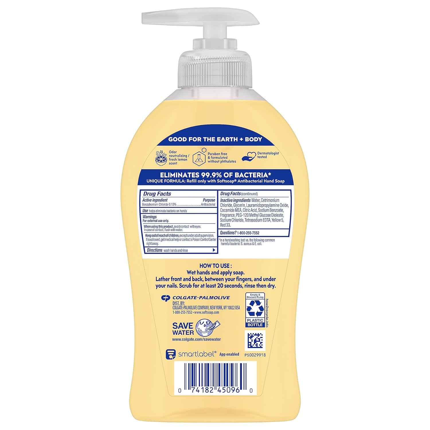 Wash away dirt and bacteria with Softsoap Kitchen Fresh Hands Antibacterial Hand Soap. This unique formula contains moisturizers to leave your skin feeling soft and protected. It also gently cleans and protects your hands by helping to eliminate 99.9% of bacteria (based on a handwashing test vs the following common harmful bacteria: S. aureus & E. coli). The fresh lemon hand soap scent helps neutralize the smell of food on your hands, making this an ideal kitchen hand soap. Due to its unique formula, this hand soap pump should only be refilled with Softsoap Antibacterial Liquid Hand Soap.