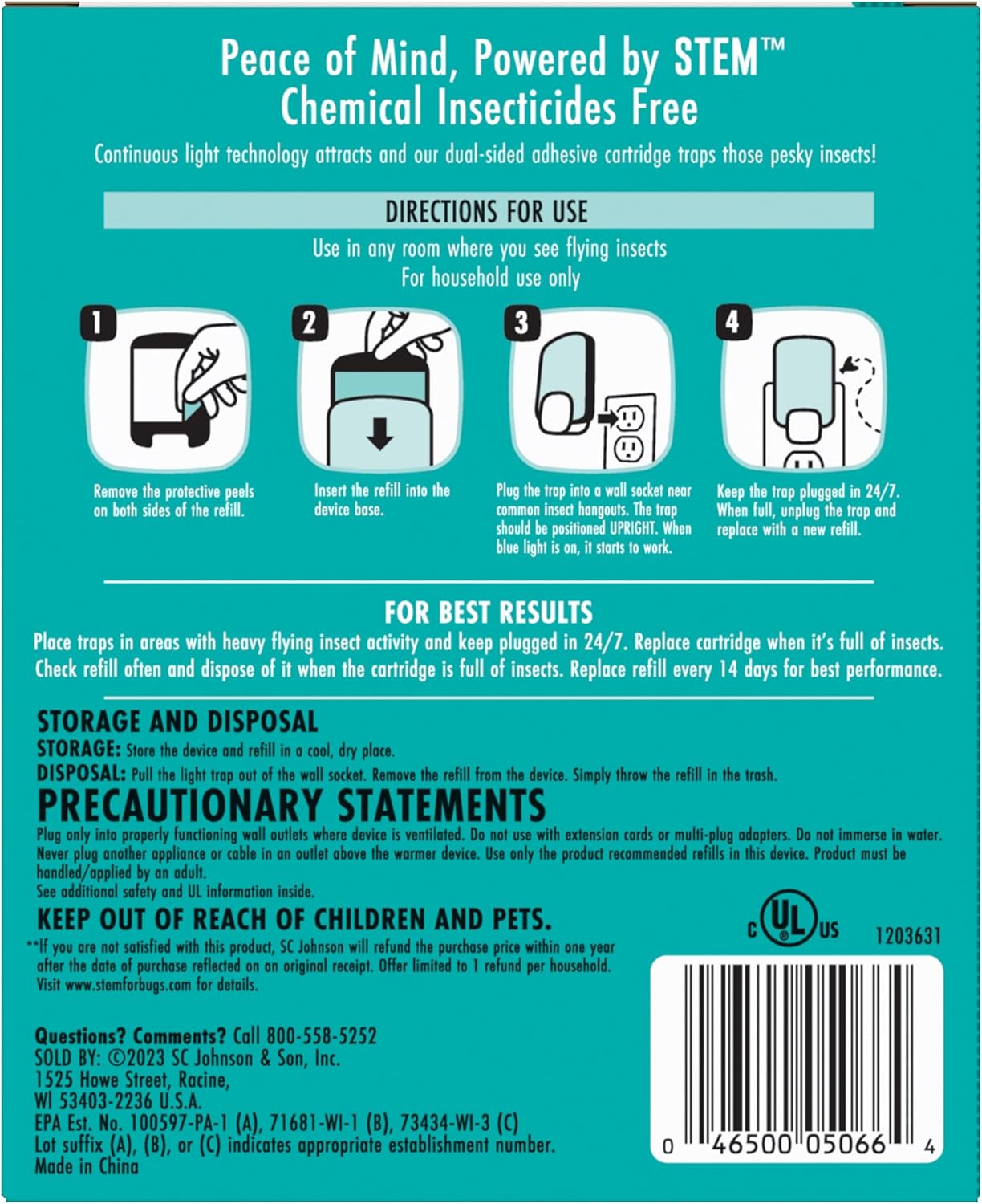 STEM Flying Insect Light Trap is an easy, mess-free option for attracting and trapping a variety of flying insects like fruit flies, gnats, mosquitoes and moths. Use this discreetly-designed fruit fly trap in any indoor room where insects are present, especially around fruit, trash cans, garages and entryways. Enjoy the odor-free, soft blue light technology that carefully traps insects with no chemical insecticides. We crafted our moth and mosquito trap to be people, plant, pet-friendly* for 24/7 continuous attraction. It's easy to use and install. Simply remove protective peels, insert the dual-sided adhesive cartridge into the flying insect trap base, plug in to a wall, and position using the customizable 90-degree rotating plug and leave on 24/7. No need to touch any bugs or get your hands sticky. Replace the cartridge every 14 days or when cartridge is full of bugs. This bug trap is compatible with Raid Essentials light trap refills as well. *when used as directed