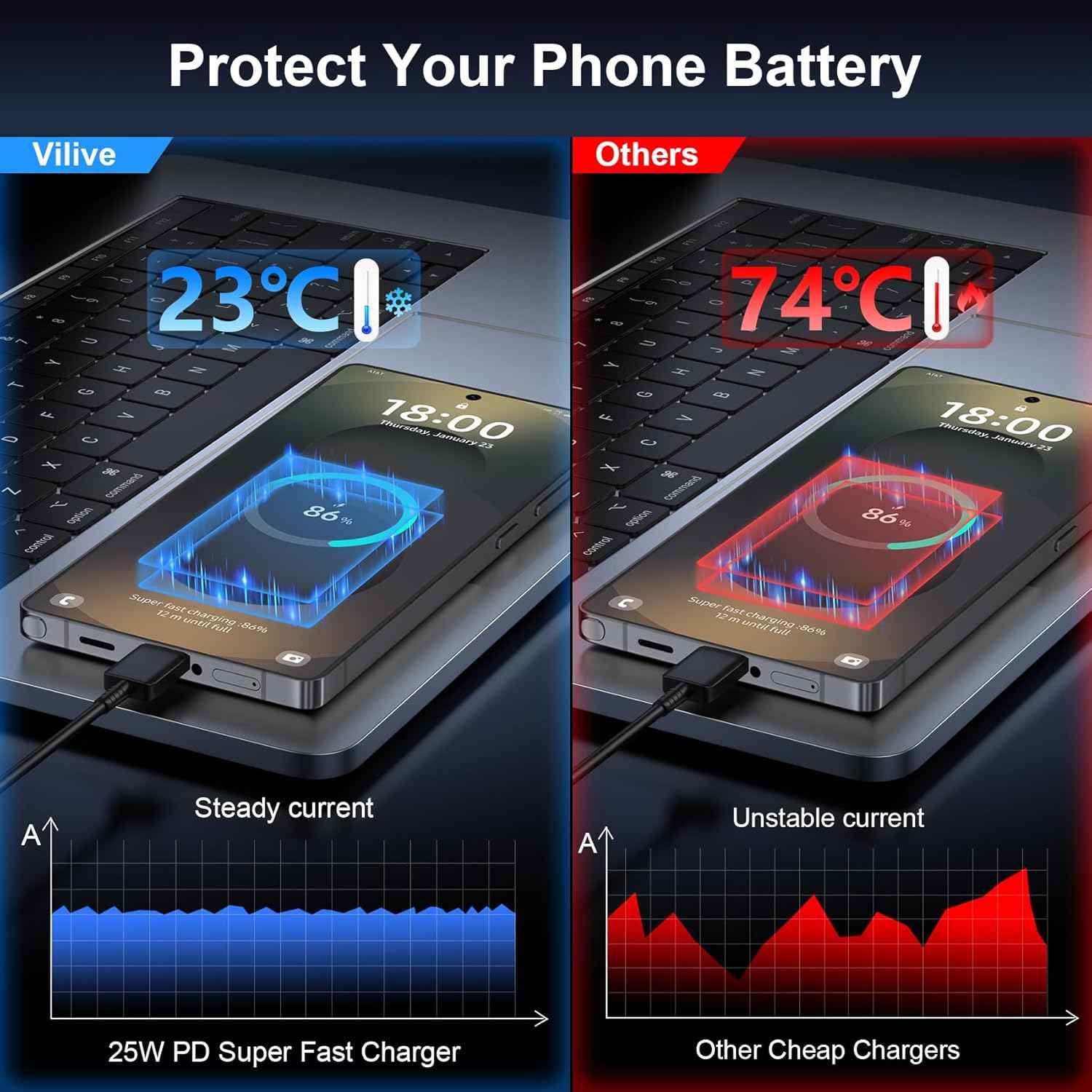 This super fast charger is made up of premium ABS material, with heating dissipation function, not easy to be high temperature.