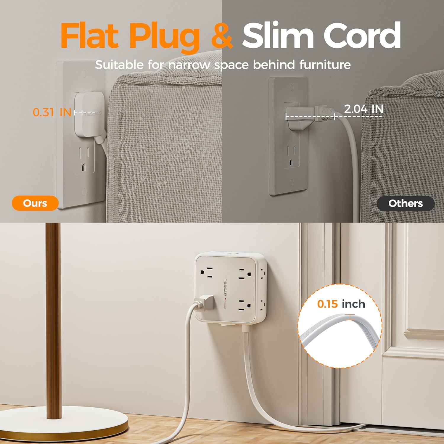 The 0.31 inch ultra slim flat plug fit in narrow spots and hide behind furniture like sofa, bed, sitting flush and nightstand, against the wall; Extension cord with USB ports can save your outlet space occupied.