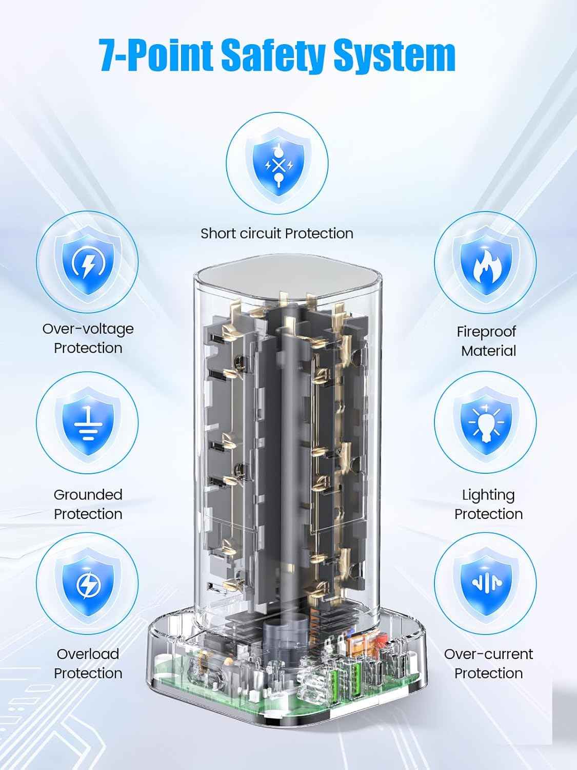 This incredible power tower contains a 1800J internal surge protector that will automatically shut down in the event of an overwhelming surge (spike/lightning). The overload protector also closes in the event of overheating, overcurrent or short circuit. All you have to do is press the reset switch on the side to turn it back on!