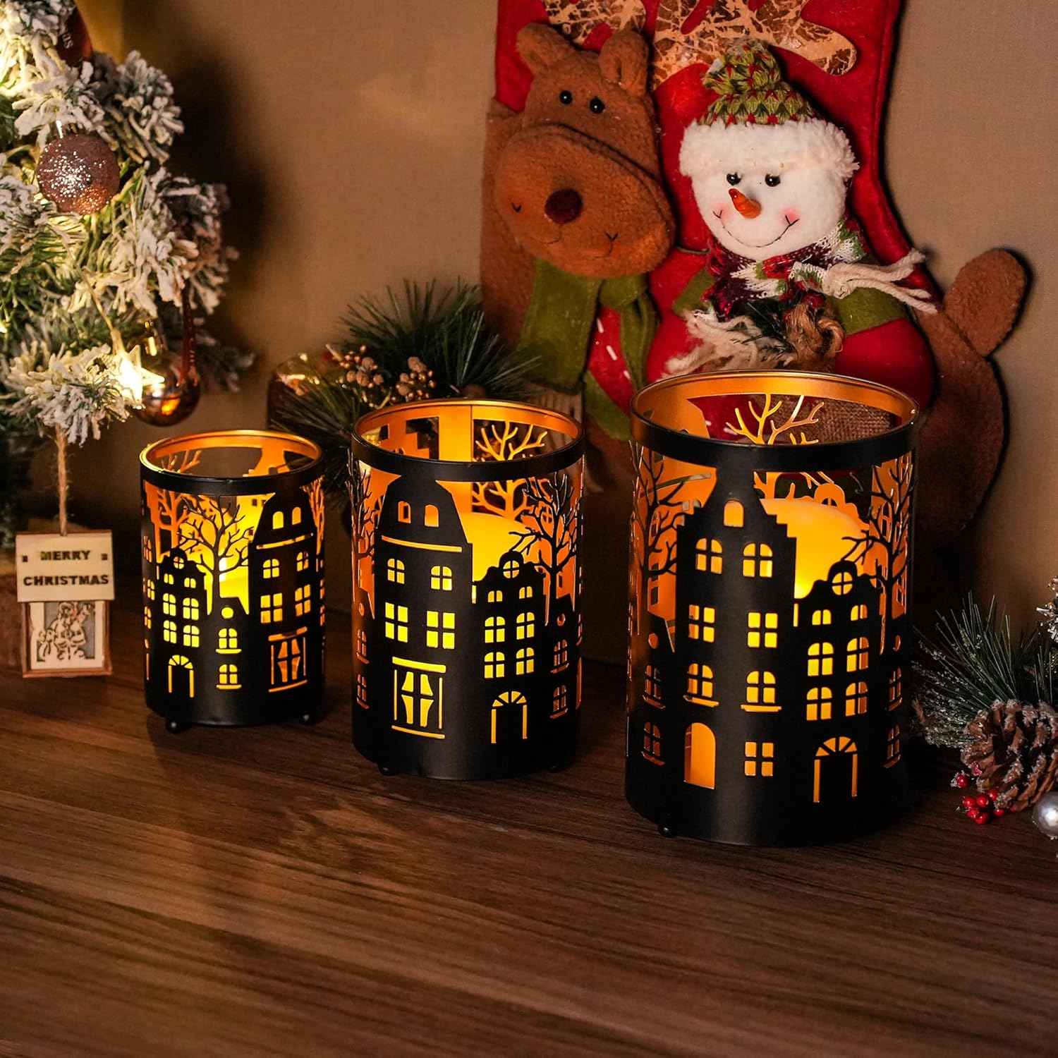 TRIROCKS Christmas Candle Lantern 7" H Etched Metal Candle Holder Christmas Decorations for Living Room Kitchen Tabletop Parties Patio Outdoors Indoors(3PCS;Bronze House)