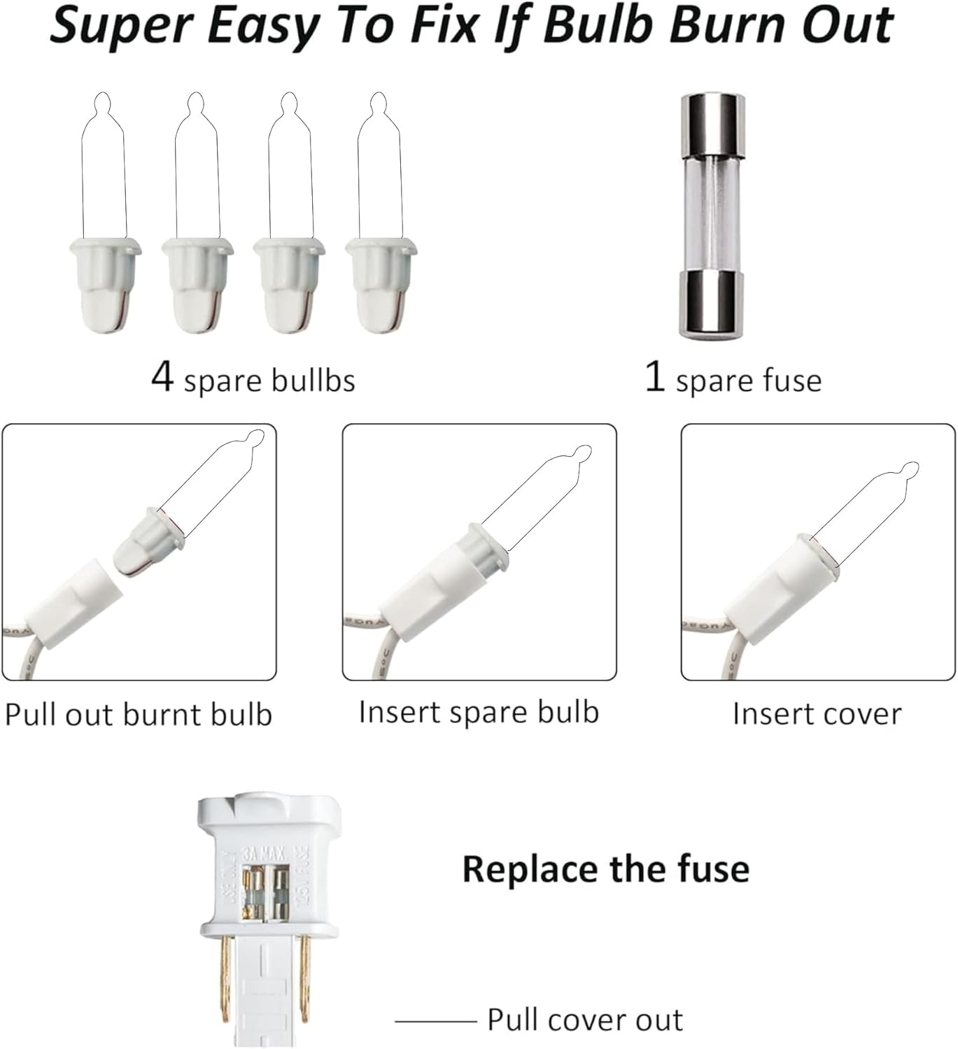 1 x 20 ft mini string light, 1 x spare fuse, 4 spare incandescent bulbs.
