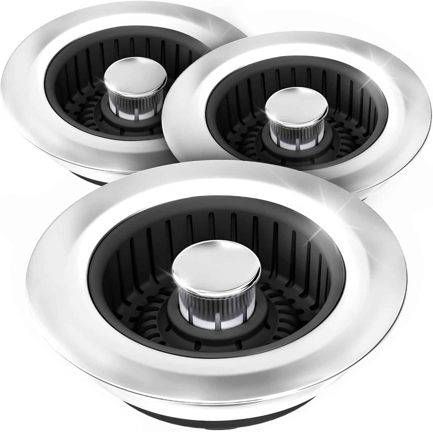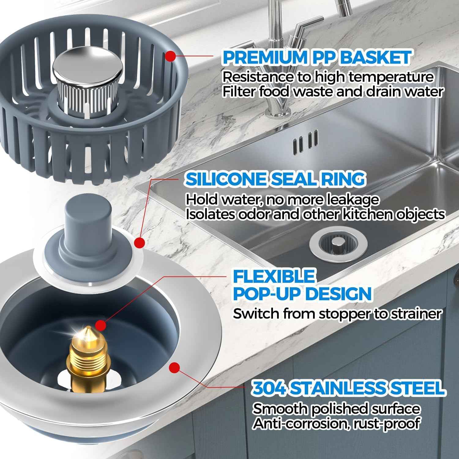 Upgraded 3in1 Kitchen Sink Drain Strainer & Sink Stopper, Stainless Steel Kitchen Drain Plug & Sink Installation Parts with Anti-Clogging Basket, Fit US Standard 3-1/2'' Sink Drain Hole, Silver