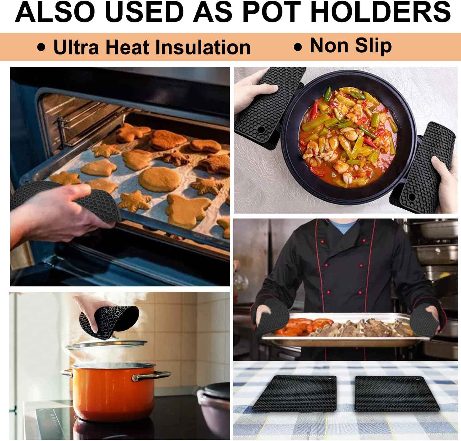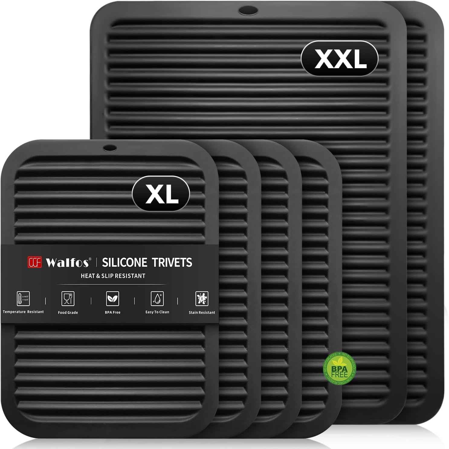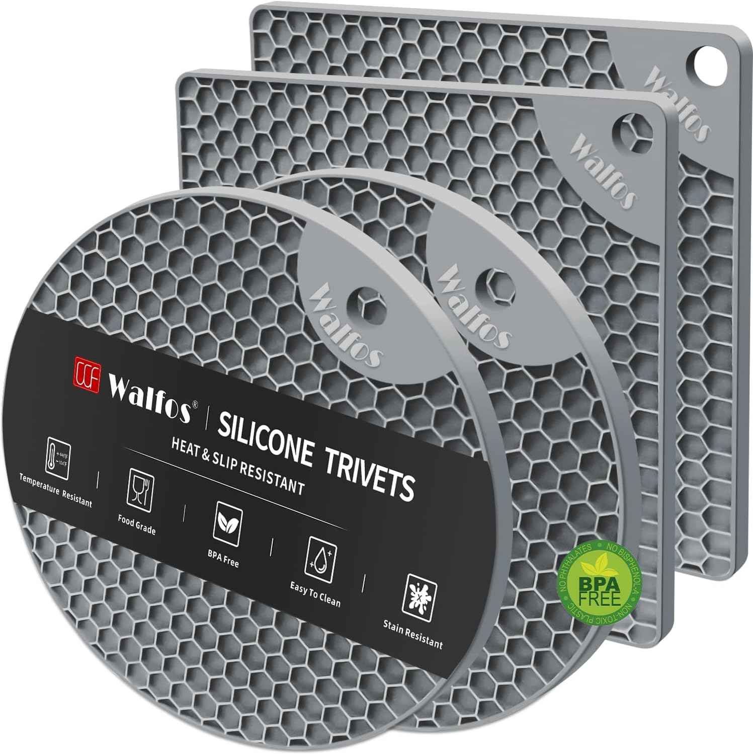 Walfos Silicone Trivet Mats - 4 Heat Resistant Pot Holders, Multipurpose Non-Slip Hot Pads for Kitchen Potholders, Hot Dishers, Jar Opener, Spoon Holder, Food Grade Silicone & BPA Free (Black)